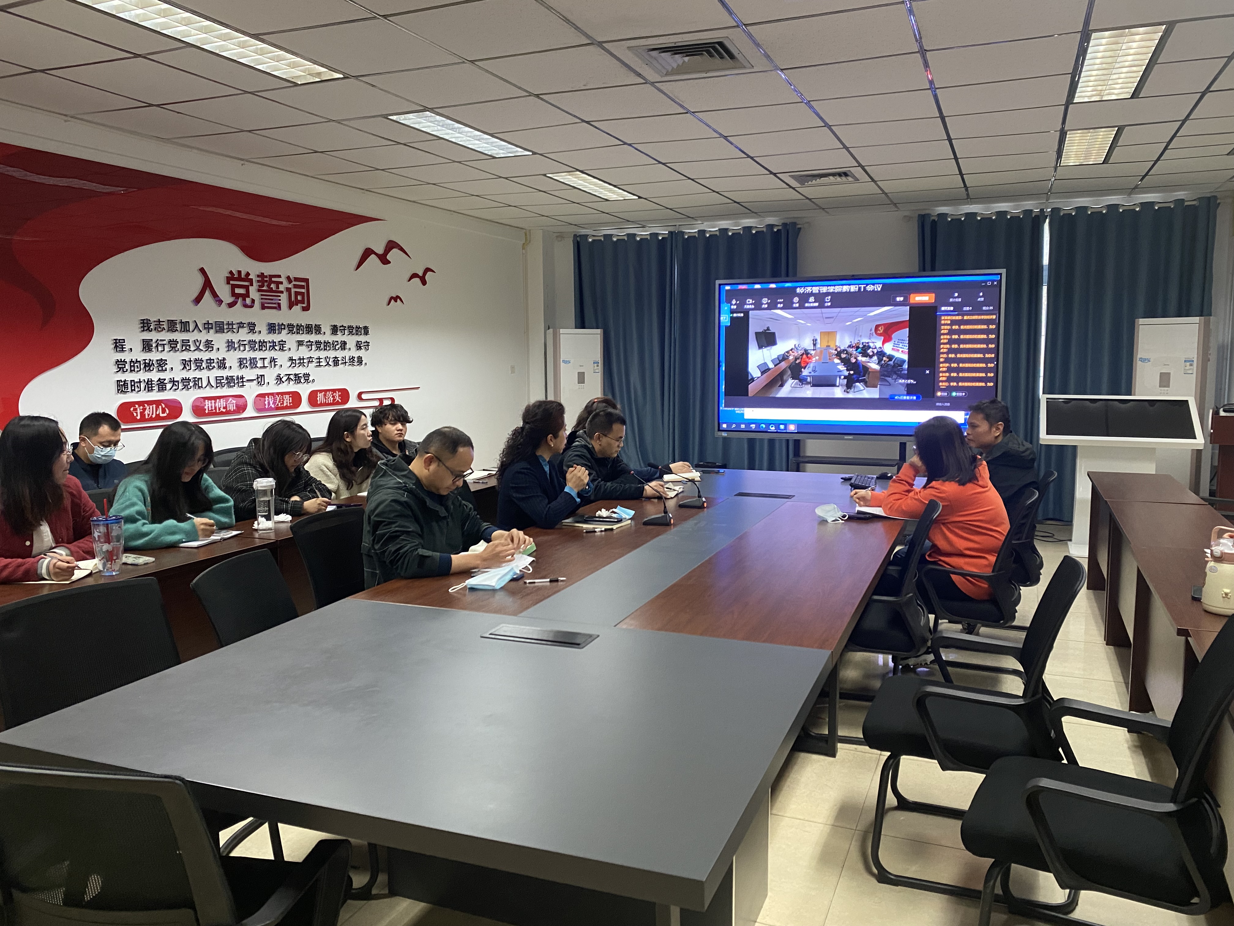 为进一步落实学校党委疫情防控工作会议要求,压实疫情防控责任,确保疫情下学院整体工作管理及教学工作稳步推进。11月17日,经济管理学院在沙龙校区综合楼二楼会议室召开疫情防控暨线上线下工作动员部署会,学院党总支书记、院长赵琳,副书记张恩广,副院长陈现军,副院长潘多,在校行政人员和全体辅导员参加了线下会议,其余教师通过钉钉软件以线上方式参会。会议由赵琳书记主持。
