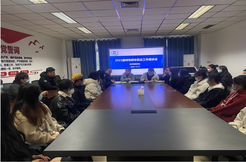 为帮助困难毕业生树立正确的就业观念,提高困难毕业生的就业能力,2022年12月2日中午,经济管理学院在沙龙校区综合楼二楼会议室组织召开了2023届特殊群体毕业生代表就业工作座谈会,学院党总支书记、院长赵琳,副书记张恩广,副院长陈现军,副院长潘多,学工科及31名2023届困难群体毕业生参会。