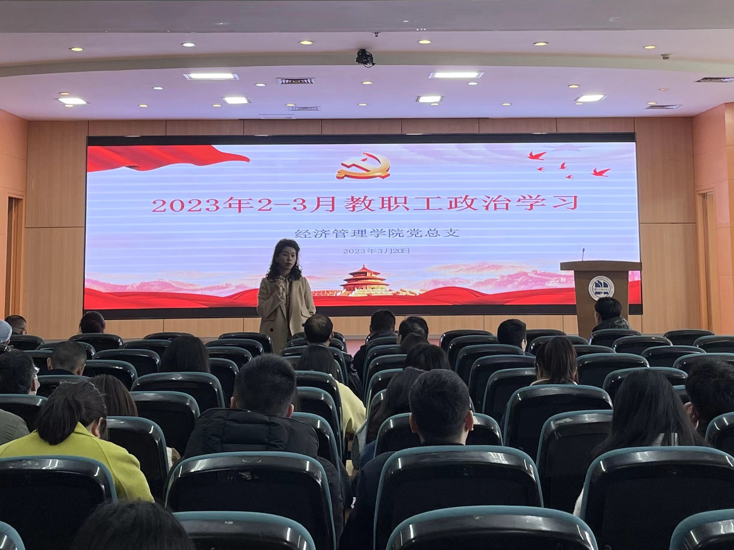 2023年3月20日,经济管理学院全体教职工在沙龙校区综合楼2楼学术报告厅开展2-3月政治理论学习,会议由经济管理学院党总支书记、院长赵琳主持。