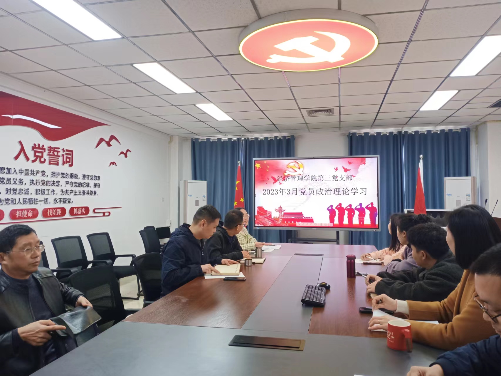 为深入学习贯彻习近平新时代中国特色社会主义思想和党的二十大精神,3月20日下午,经济管理学院党总支第三党支部在沙龙校区综合楼201会议室开展3月“三会一课”主题学习活动,会议由支部书记孙立芳主持,全体党员参加学习。
