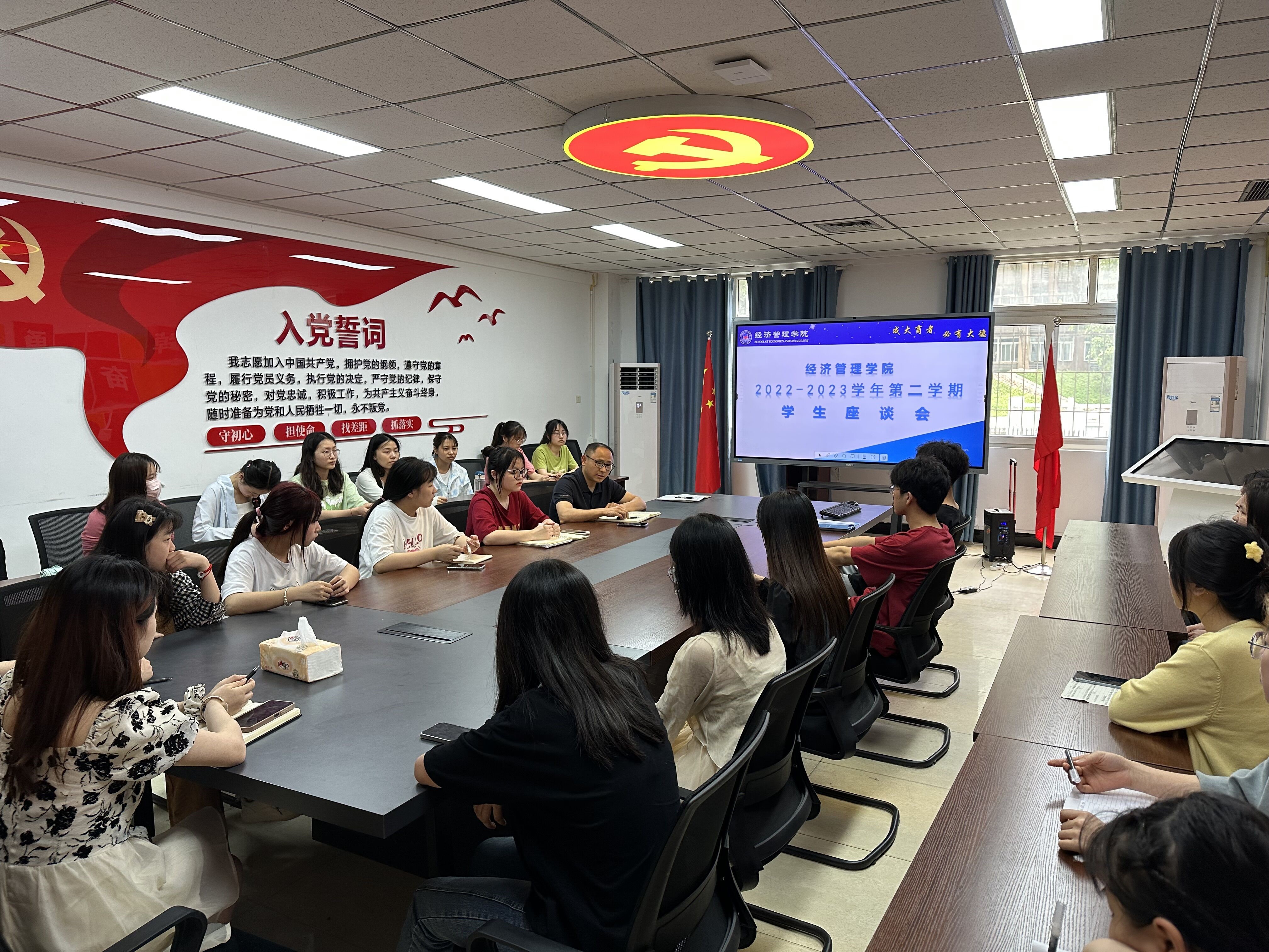 为加强学生与教师之间的交流,倾听学生心声,间接了解任课教师上课情况,及时发现并解决教、学、管中存在的问题,有针对性地实施教育教学管理,进一步提高我院的教育质量,经济管理学院于4月18日下午在沙龙校区综合楼二楼会议室召开2022-2023学年第二学期学生座谈会,学院副院长陈现军、教学干事程钢及各班学生代表参加了座谈会。