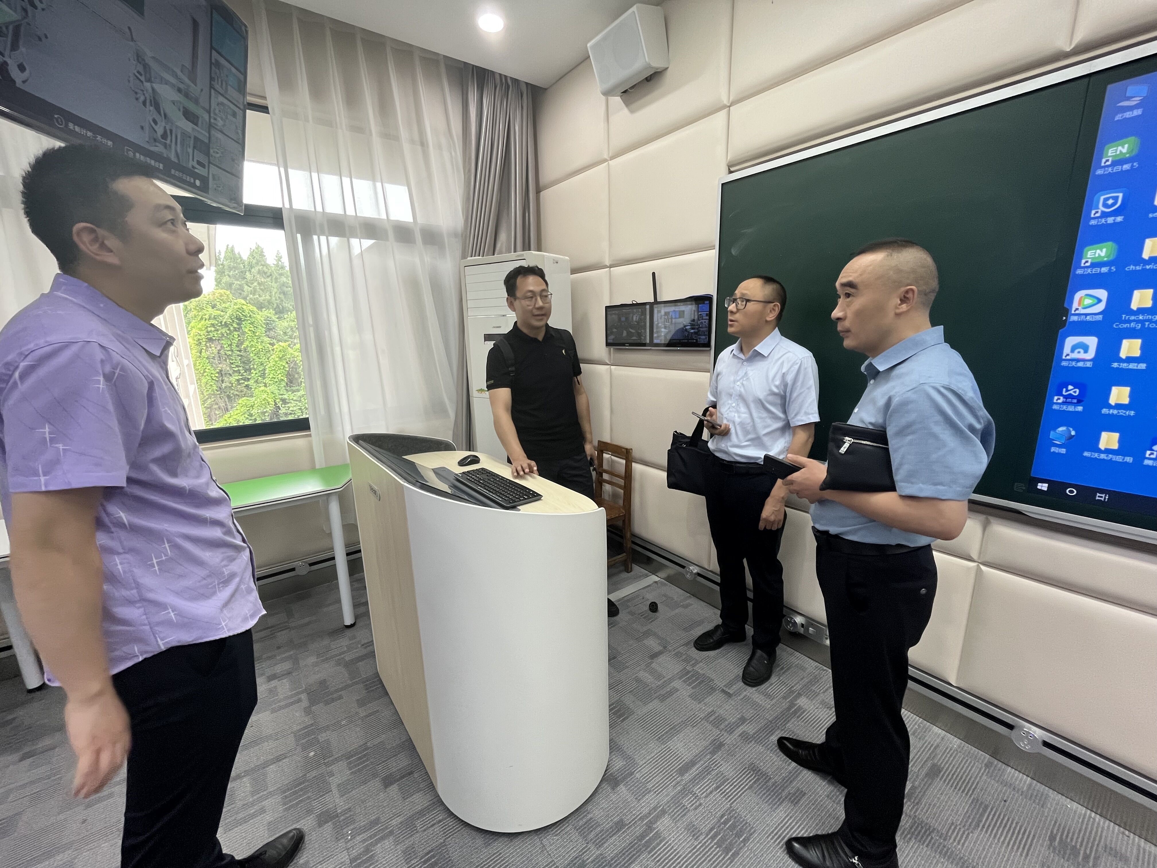 陈现军一行先后前往参观了西南大学、重庆师范大学的精品录播教室、网络互动教室、多屏研讨教室等多种智慧教室,分别对录播设备、触摸一体机、交互式电子屏、录播平台等进行了亲身体验,并针对智慧教室环境、设备、系统兼容等细节问题与承建单位和学校相关管理人员进行了深入交流。