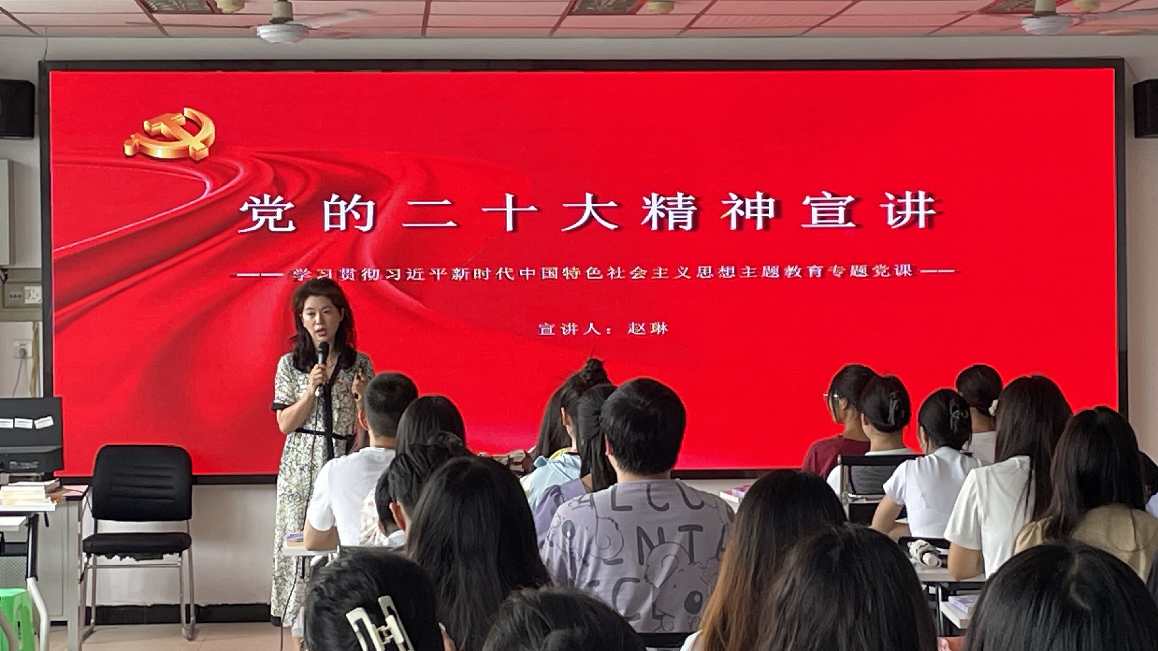 赵琳书记以二十大召开的意义为切入点,阐述党的二十大在政治、理论、实践上取得的一系列重要成果,深刻阐明开展学习贯彻习近平新时代中国特色社会主义思想主题教育是推动贯彻党的二十大精神战略部署的有力举措,带领学生深入理解把握习近平新时代中国特色社会主义思想的重大意义和中国式现代化的本质要求,深刻学习领悟五个“牢牢把握”和新时代十年伟大变革,勉励学生做到“六个坚持”,艰苦奋斗、锐意创新,努力实现新时代青年学生的使命与担当。