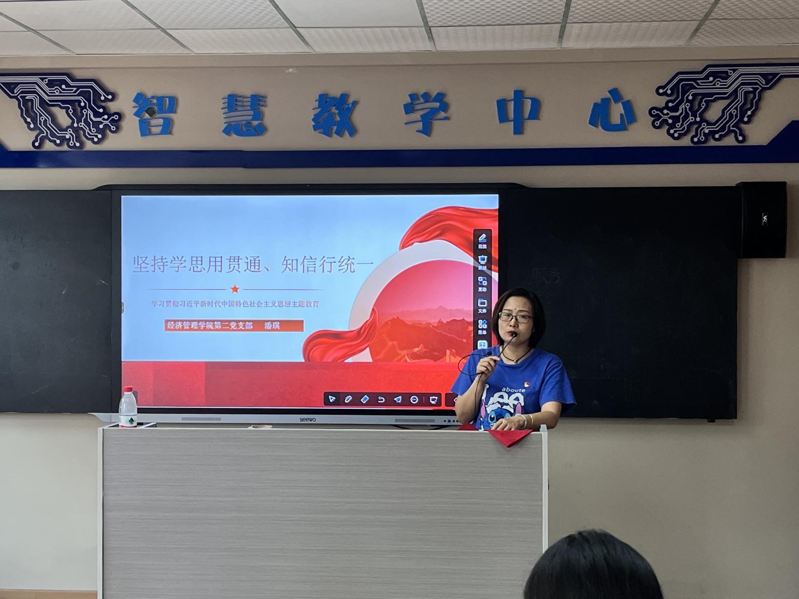 为持续深入开展学习贯彻习近平新时代中国特色社会主义思想主题教育,努力把学习成果转化为推动学院事业发展的强大力量。6月15日中午,经济管理学院党总支第二党支部在沙龙校区综合楼中餐实训室开展主题教育专题党课培训,第二党支部书记潘琪老师带领全体党员师生和入党积极分子深入学习和探讨。