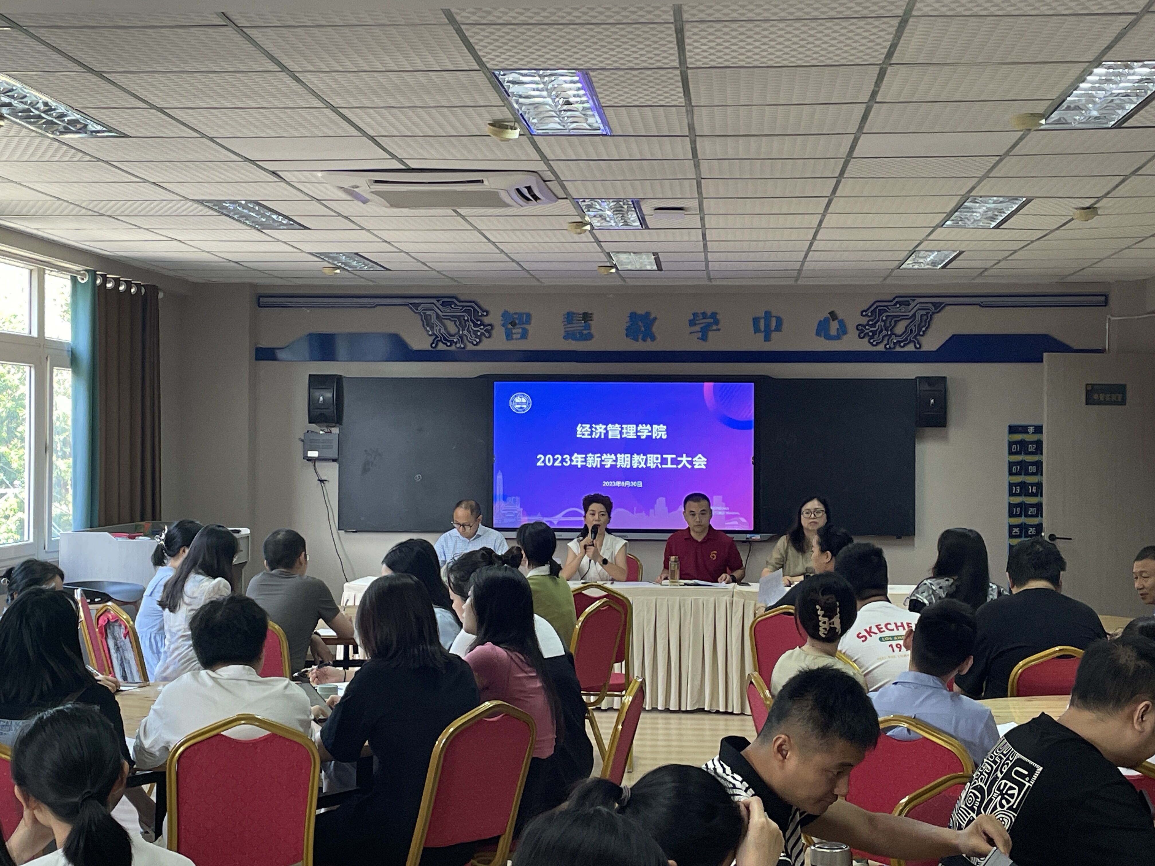 为确保新学期各项工作有序开展,落实本学期开学各项任务,8月30日上午九点,经济管理学院在沙龙校区综合楼五楼中餐厅实训室召开新学期教职工大会,经济管理学院全体教职工参加会议,会议由经济管理学院党总支书记、院长赵琳主持。