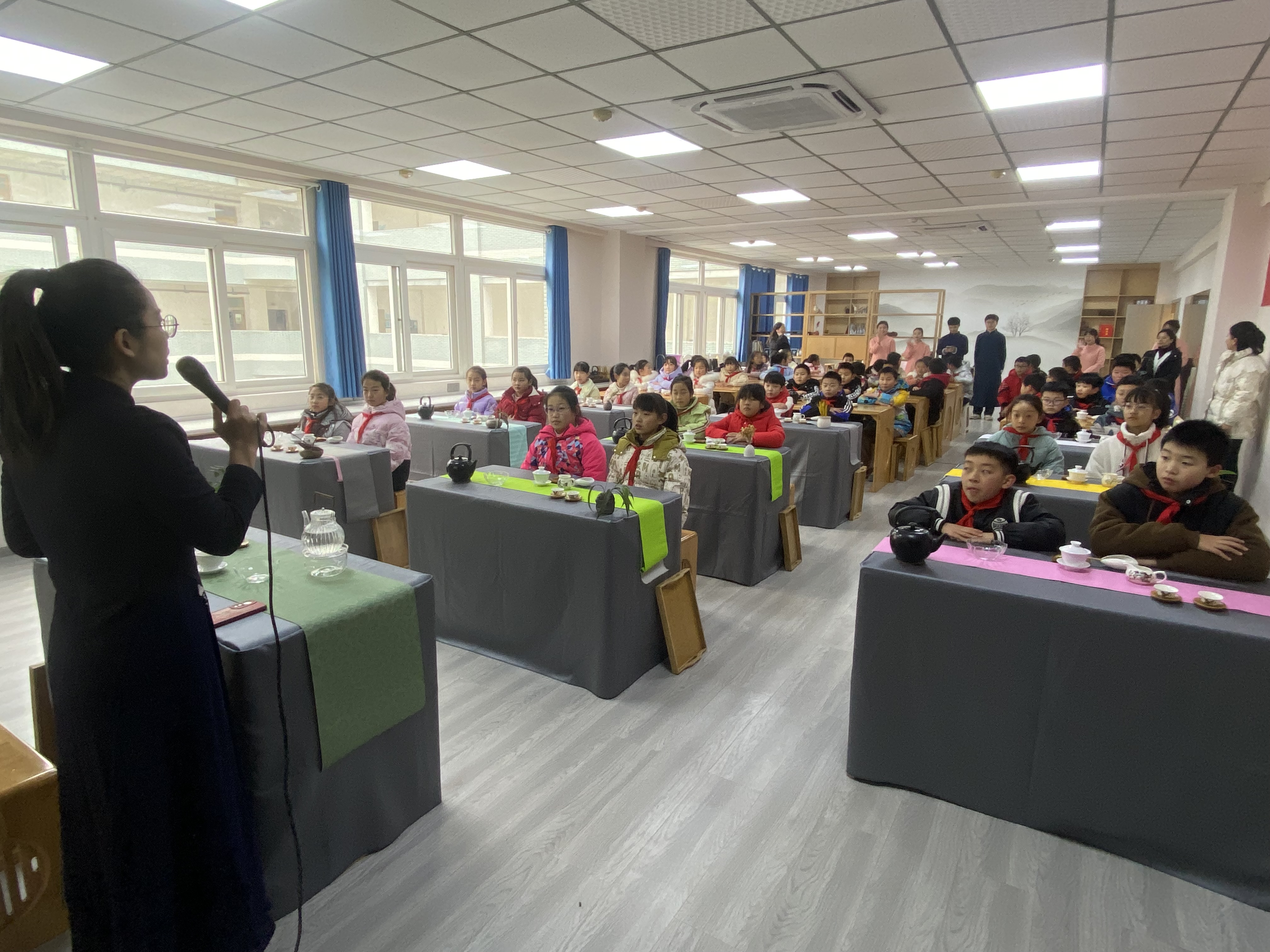 在大师工作室成员王开香老师的引导下,小朋友们从中国传统茶文化礼仪入手,逐步学会了茶具认知、泡茶技巧以及感悟茶道精神;同学们跟着老师品茗香、识茶礼,亲手泡茶,向老师敬茶,了解了历史悠久的茶道文化,体验了中国优秀传统文化的博大精深。互动环节中,孩子们争先举手,表现出了浓厚的学习兴趣。