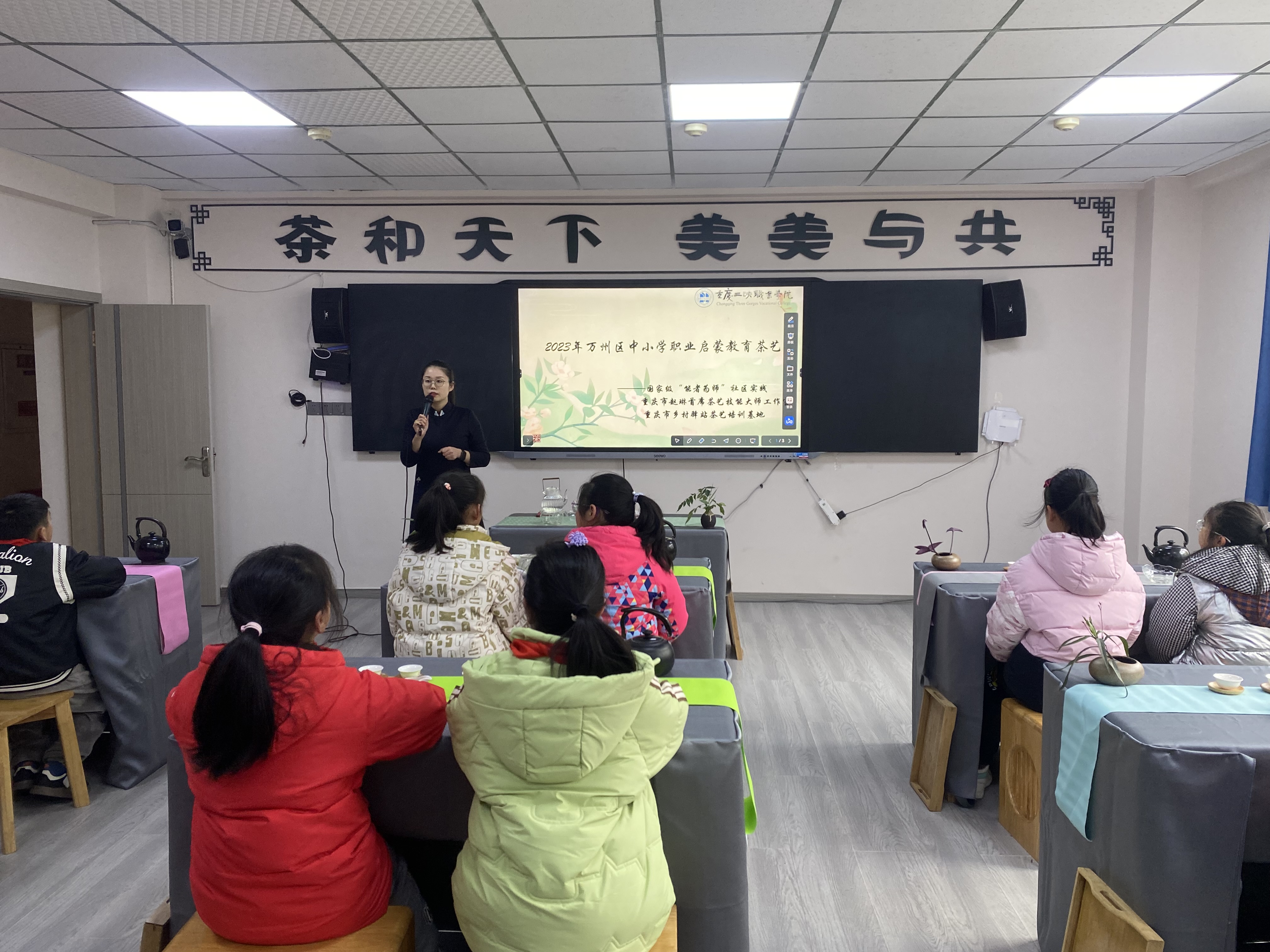 为贯彻落实市教委、区府《关于推动万州区职业教育高质量发展加快渝东北三峡库区城镇群建设的意见》(万州府发〔2023〕1号)精神,促进全区中小学生形成健全人格和良好的思想道德品质,树立正确的职业观、劳动观和人生观,推动职业教育资源面向基础教育开放,2023年12月19日,万州区中小学生职业启蒙教育活动之茶艺习礼在沙龙校区赵琳茶艺技能大师工作室举行,来自与学院“手拉手”合作的南京小学60余名小学生参加了茶艺启蒙培训学习。
