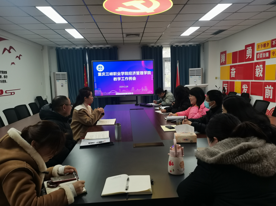 为进一步统一思想、凝聚共识、明确目标、夯实责任,高标准做好新学期各项教学工作,2月26日下午,经济管理学院在沙龙校区综合楼二楼会议室召开2024年春季学期教学工作例会。学院党总支书记、院长赵琳,副院长陈现军,各教研室主任及教学科程钢、莫英莺参加会议。会议由赵琳书记主持。