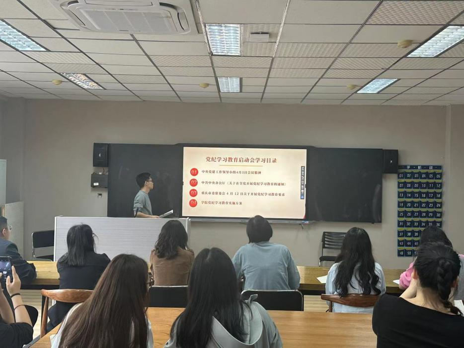 会议对支部开展党纪学习教育进行安排,宣布启动支部党纪学习教育工作,与会师生一起学习了中央党的建设领导小组4月3日会议精神、中共中央办公厅《关于在全党开展党纪学习教育的通知》、重庆市委常委会4月12日关于党纪学习教育要求以及学院党委党纪学习教育实施方案。随后,党员教师还开展了4月政治理论专题学习。