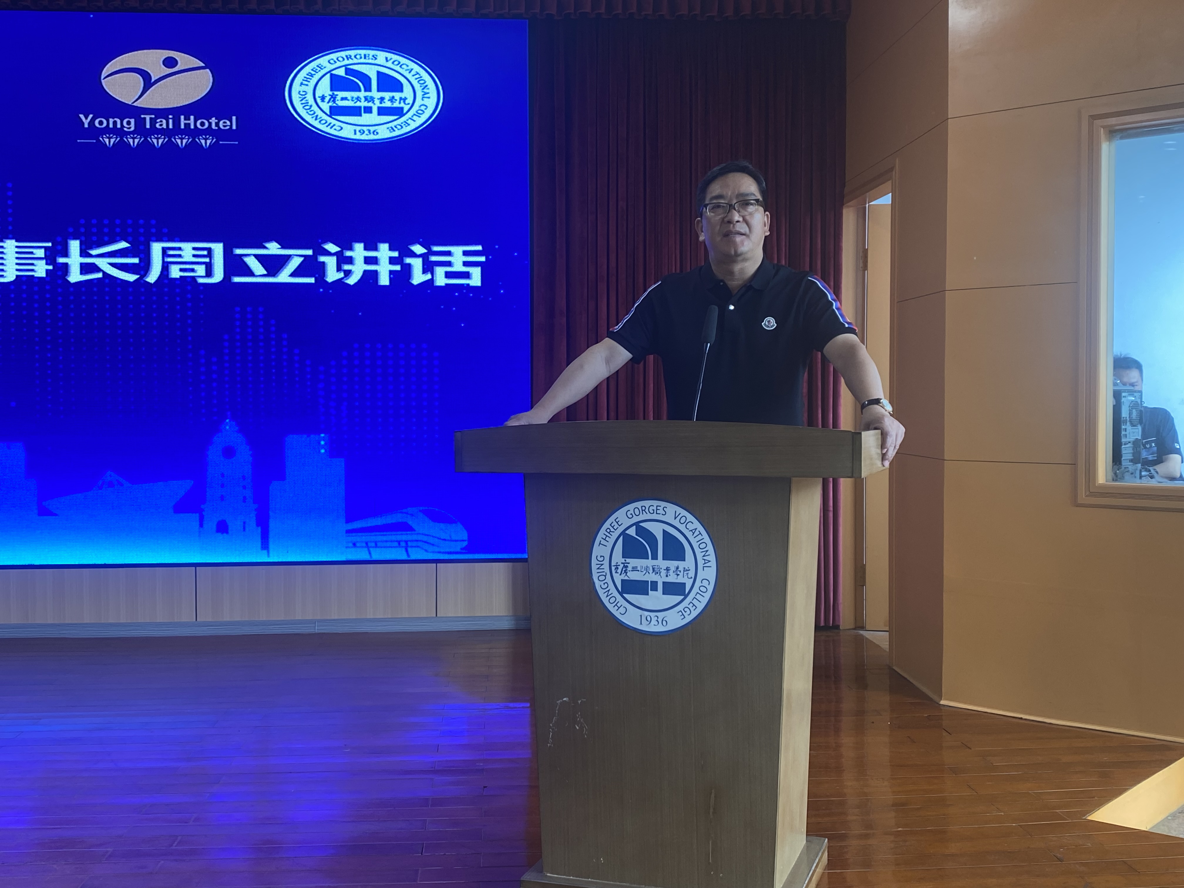 浙江柯桥永泰柯岩酒店董事长周立代表企业方讲话,介绍了柯桥永泰柯岩酒店的基本情况和近年来取得的成绩,他表示,公司始终坚持中国式现代化发展理念,致力于为旅客提供满意的住宿体验和优质的酒店服务,以“待人如己”的真诚服务及个性化的定制体验引领浙江酒店行业高品质、国际化发展,双方合作近二十年来,在提升教师技能、学生实训方面取得了丰硕的成果,产业学院的成立,必将成为校企合作的又一个新起点,会带来更加广阔的合作空间和合作前景。