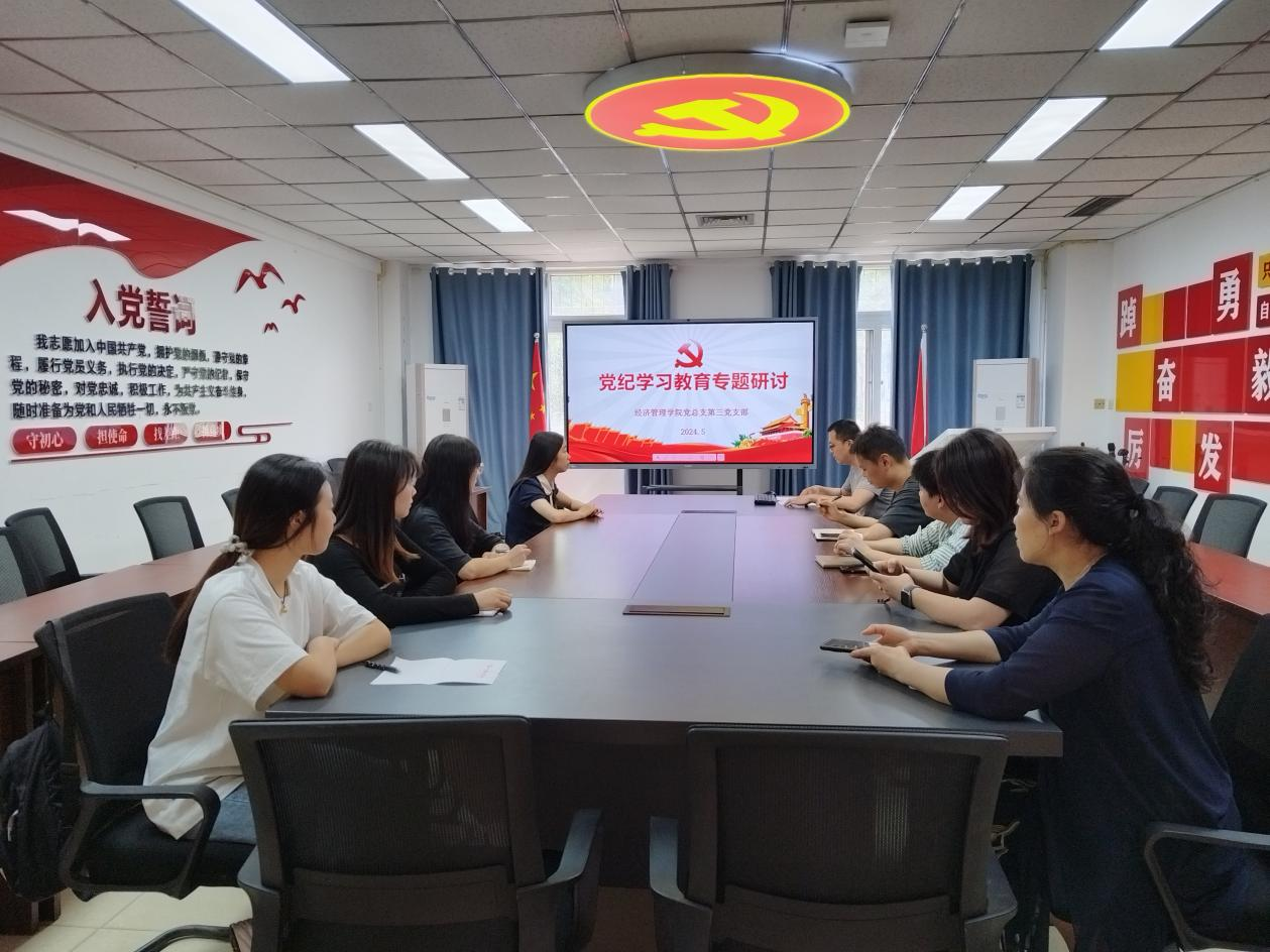 按照学院党纪学习教育的安排,5月21日,经济管理学院党总支第三党支部在沙龙校区综合楼二楼会议室开展党纪学习教育第二次专题研讨,会议由支部组织委员李毅主持,全体党员参加学习。