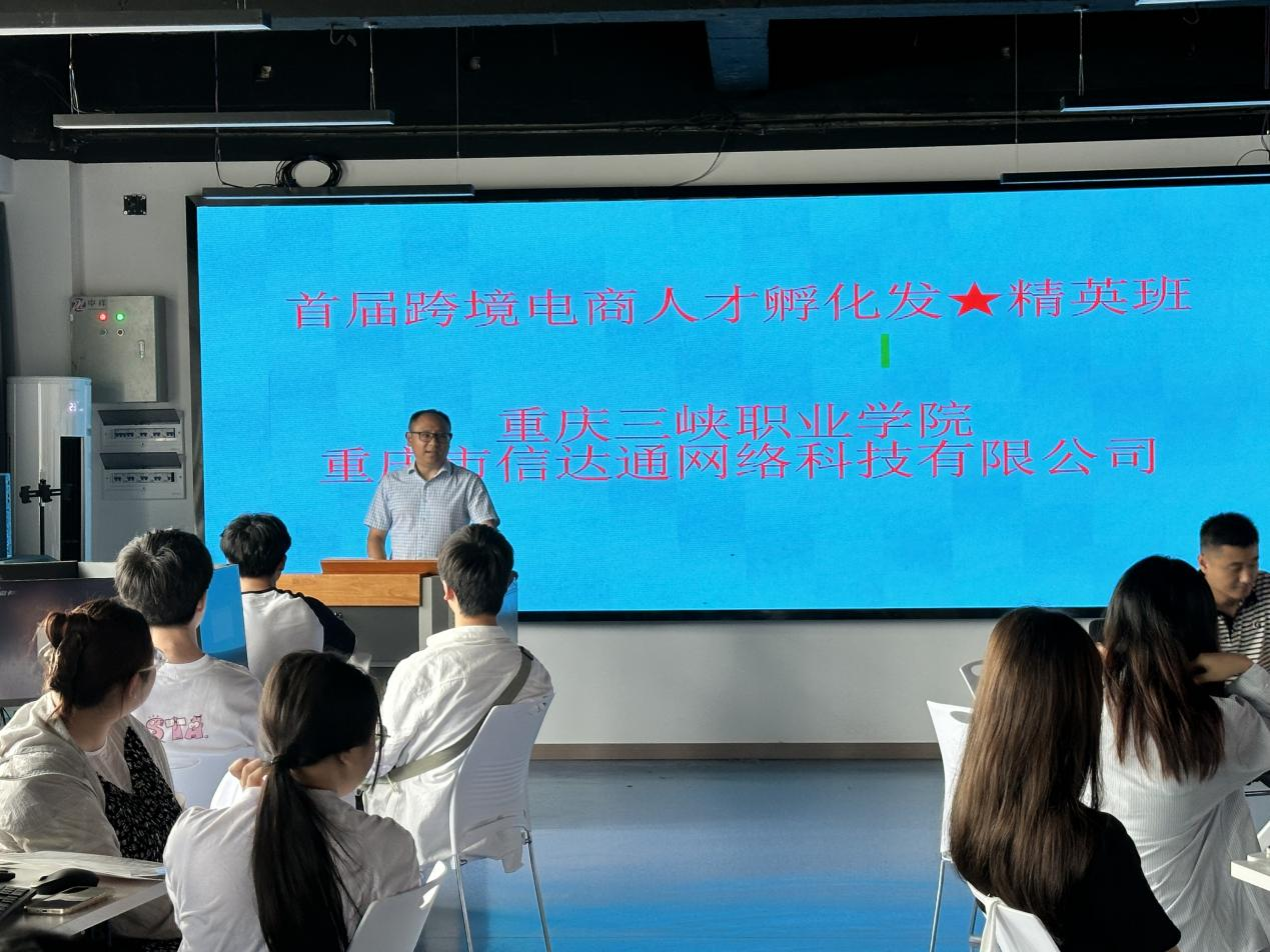为积极响应国家号召,不断探索深层次校企合作模式,协同培养高素质跨境电商人才,推动电商行业高质量发展,6月17日,重庆三峡职业学院、重庆市信达通网络科技有限公司首届跨境电商人才孵化精英班在沙龙校区综合楼801实训室举行开班仪式。经济管理学院副院长陈现军、重庆市信达通网络科技有限公司总经理彭佳以及45名学生参加了开班仪式,仪式由物流教研室主任王平主持。