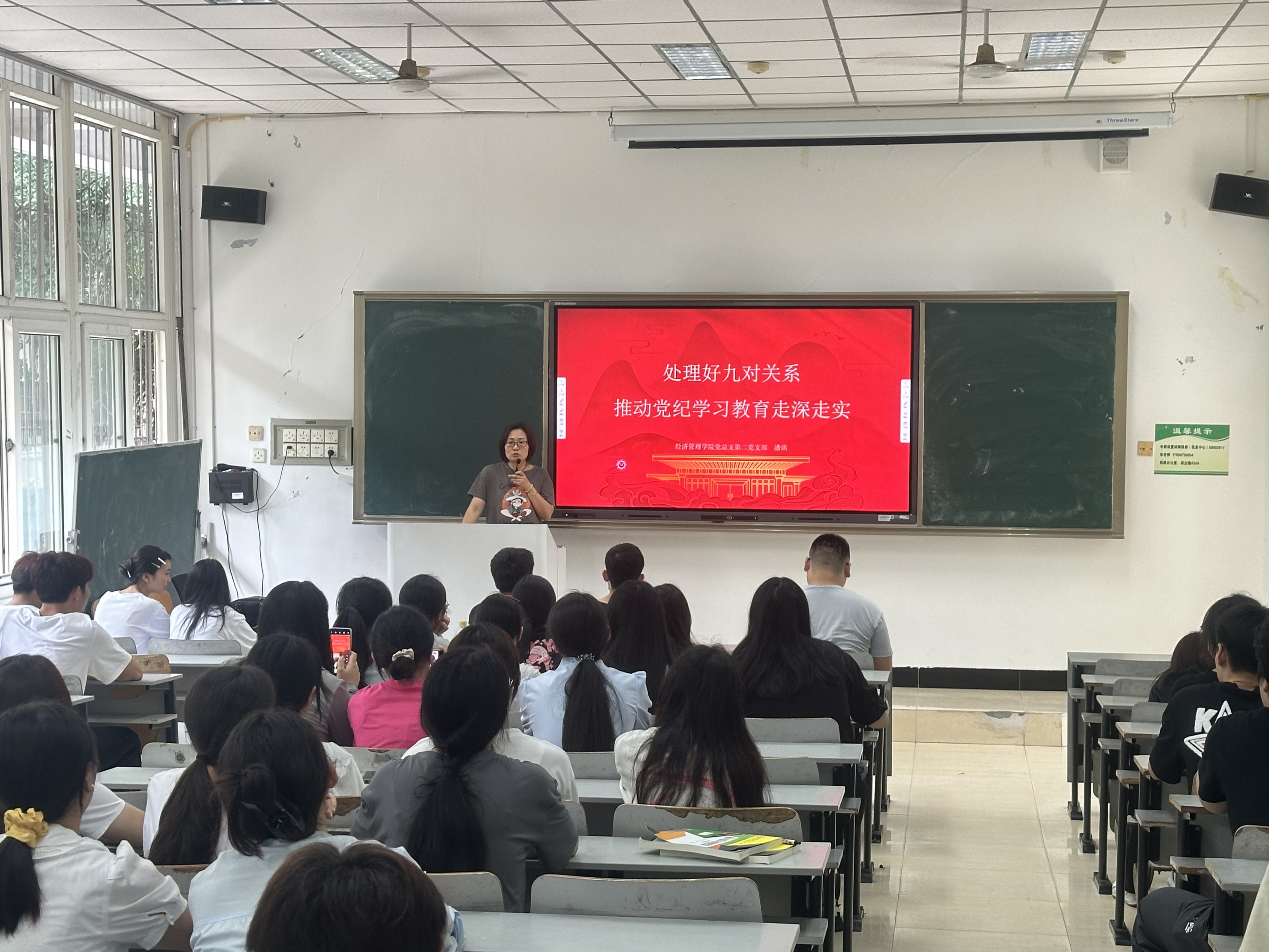 为推进党纪学习教育走深走实,教育引导师生增强纪律规矩意识,6月20日,经济管理学院党总支第二党支部书记潘琪在沙龙校区综合楼101教室作主题为“推动党纪学习教育走深走实”的党课宣讲,支部全体党员、入党积极分子和旅游大类专业学生参加了学习。
