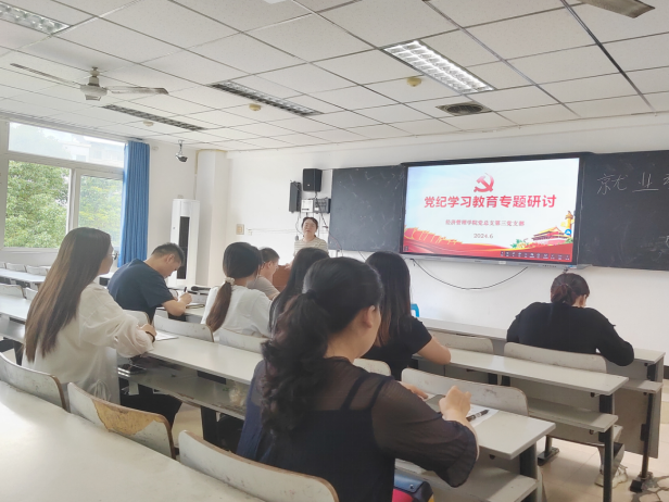 6月24日,经济管理学院党总支第三党支部在沙龙校区综合楼301教室开展党纪学习教育第五次专题研讨,会议由支部书记孙立芳主持,全体党员参加学习。