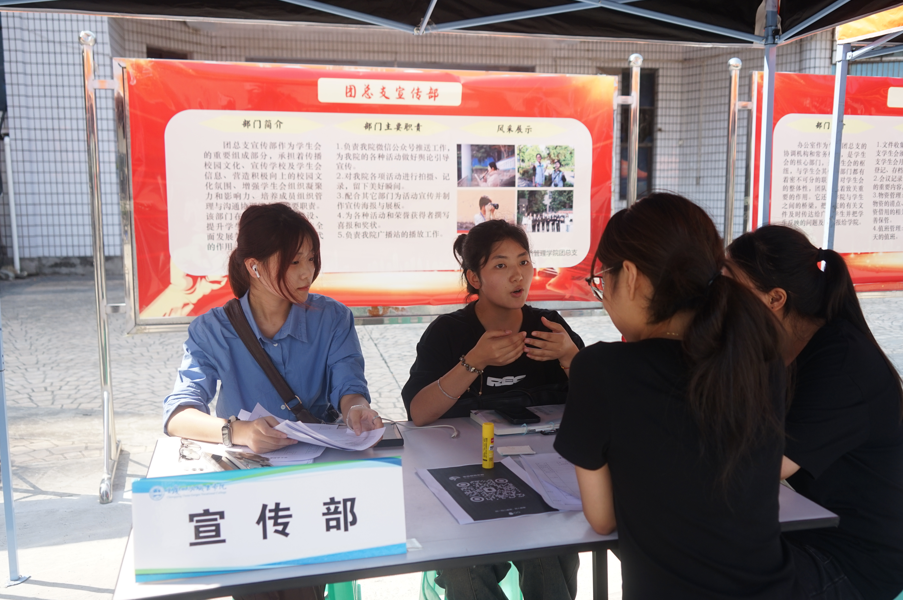招新现场气氛热烈,人头攒动,各部门的招新摊位前都围满了前来咨询和报名的新生,工作人员热情地为新生们介绍部门工作内容、解答疑问,并鼓励他们根据自己的兴趣和特长选择适合的部门。