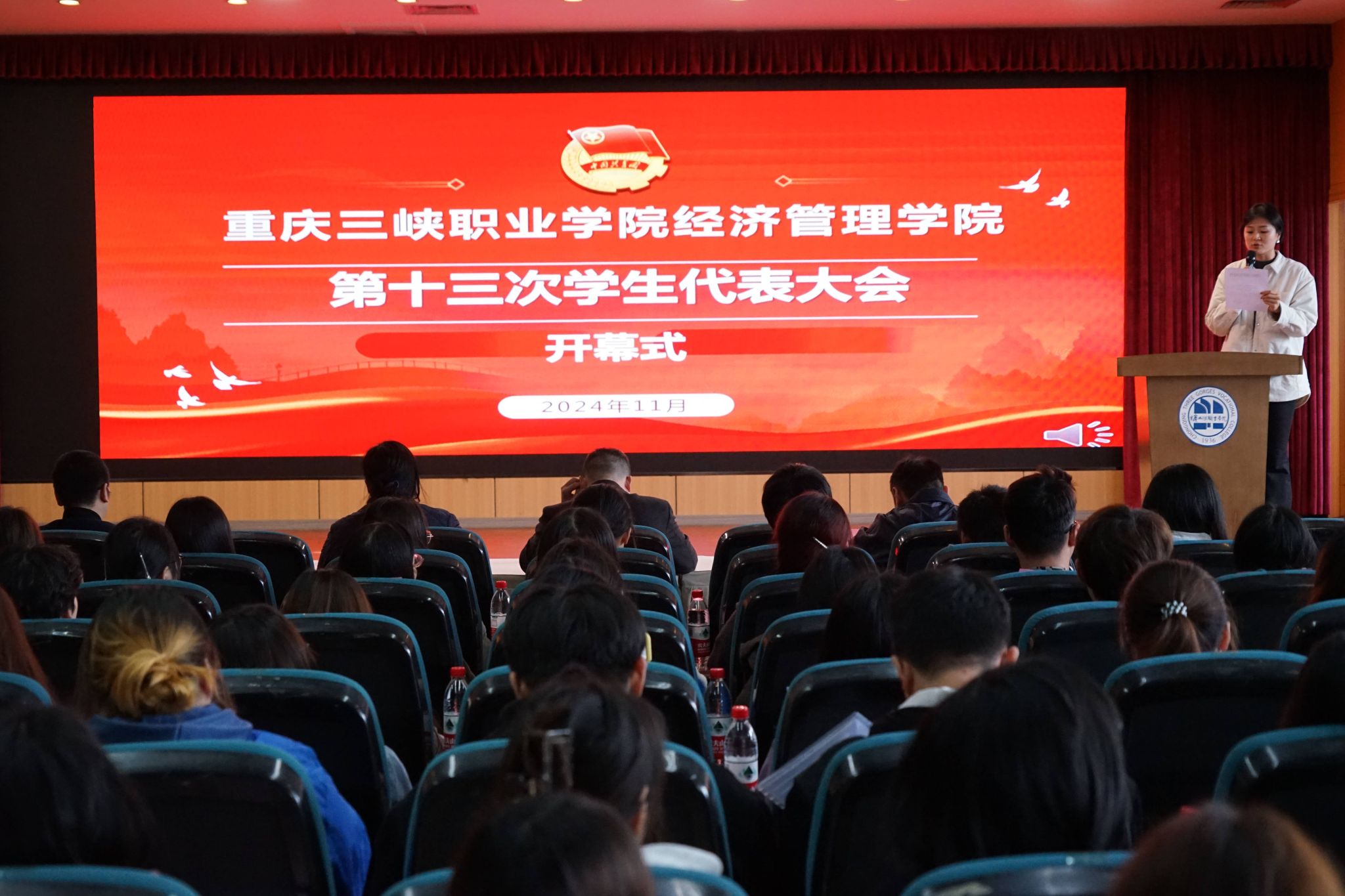 在全国上下深入学习贯彻党的二十届三中全会和全市教育大会精神之际。11月25日,重庆三峡职业学院经济管理学院第十三次学生代表大会在沙龙校区综合楼学术报告厅顺利召开。经济管理学院党总支书记、院长马绍文,副院长潘多,专职组织员李静,学工科副科长邹建华,辅导员代表、各二级学院学生会代表共计200余人参加会议。