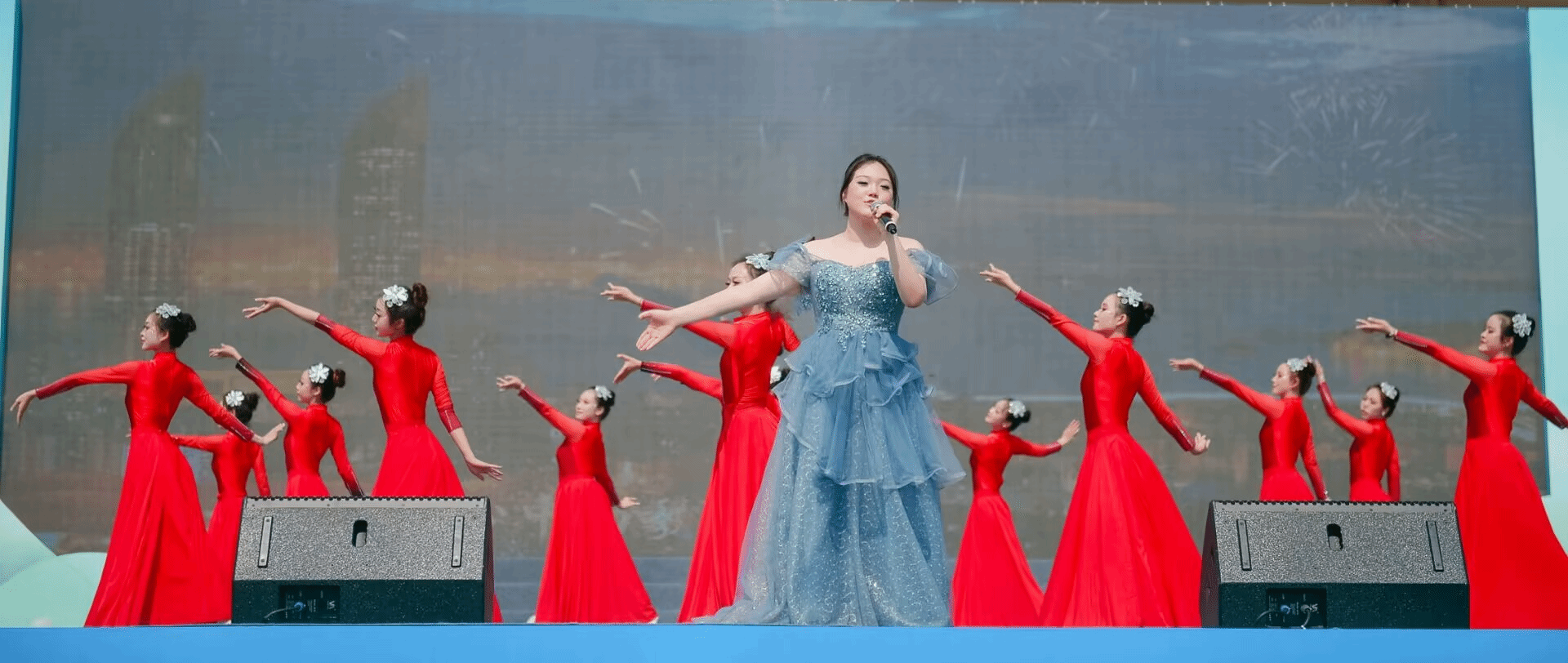 我院同学们压轴出场,领唱的歌声与舞者们轻盈的步伐相得益彰,时而低吟浅唱,时而激昂高亢。舞者们以灵动的肢体语言勾勒出城市的霓虹闪烁、乡村的万家灯火,当领唱将情感推向高潮时,舞者们迅速变换队形,层层叠叠的“灯火”组成蜿蜒长城的造型,配合背景屏幕上祖国山河的壮丽影像,视觉与听觉交织碰撞。