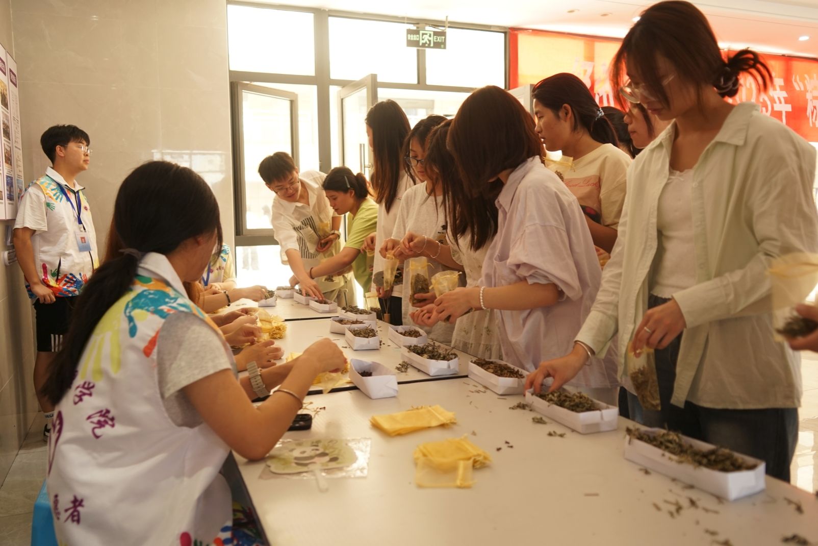 活动现场,"茶思屈原"主题区人气高涨。手工粽子制作台前,同学们在志愿者指导下学习裹叶、填馅、捆扎等技巧,并聆听粽子起源的故事;自制香囊区里,大家将香料精心装入布袋,体验传统祈福习俗。茶艺展示环节中,从传统点茶、盖碗冲泡到创新茶调饮,茶香四溢吸引众人驻足品鉴。
