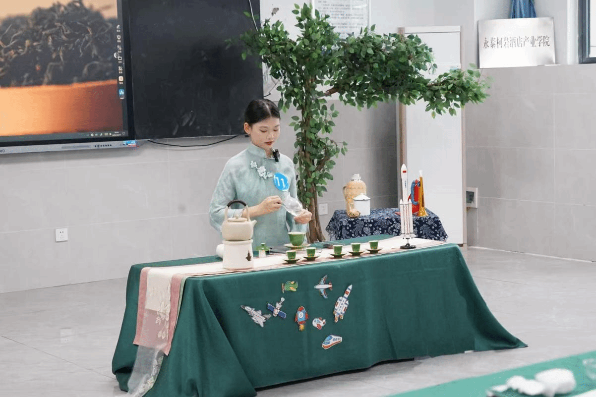 本届大赛特别注重非遗茶艺的传承与创新。源自宋代的点茶技艺被纳入核心赛项,其精细的评分标准直接源于学校开发的“宋韵点茶”课程。学校茶艺大师工作室不仅在校内推广非遗,更曾赴斯里兰卡开展茶文化传播,推动点茶技艺成为“一带一路”文化推广项目。