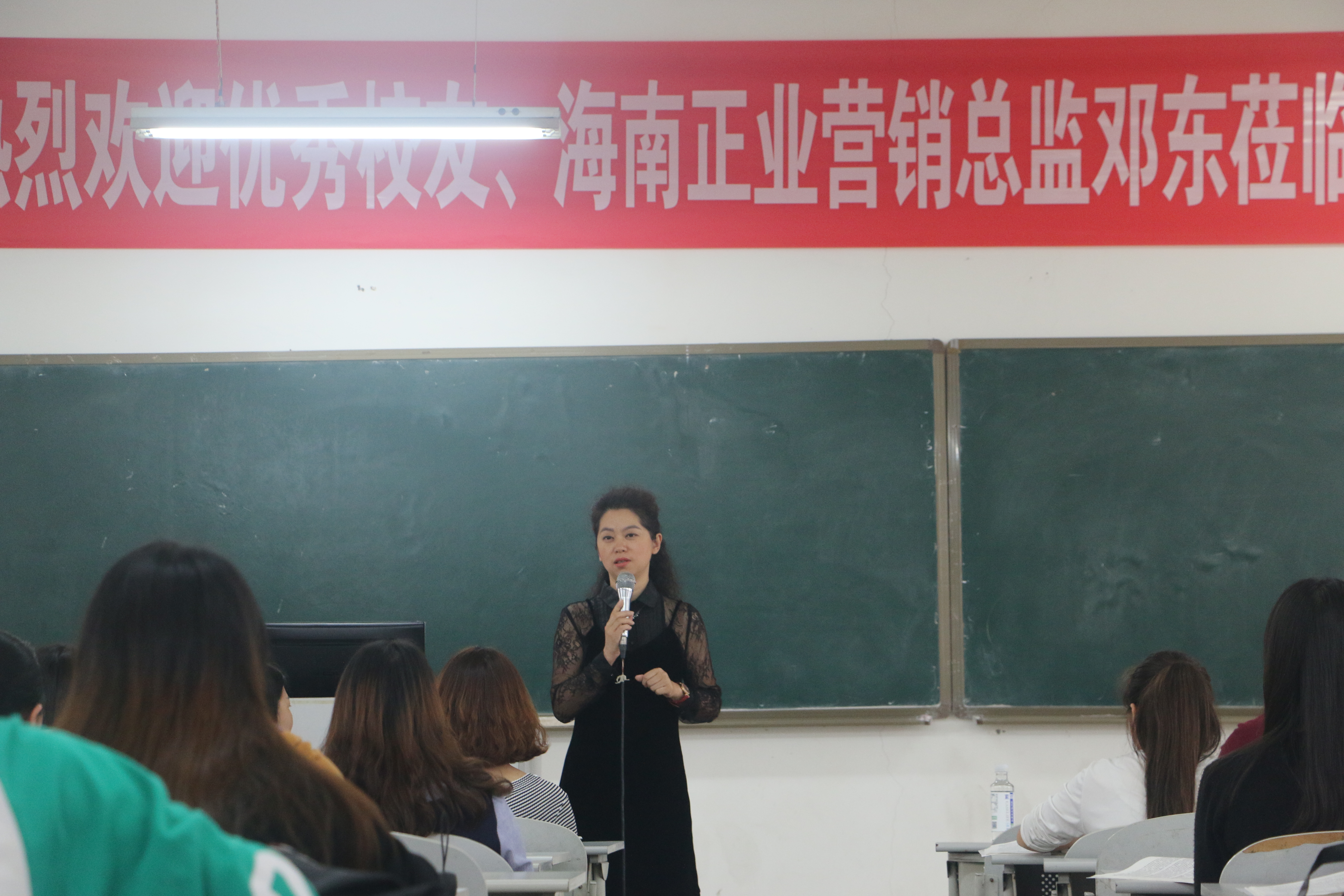 在大家期待的眼神中,邓总以一句“让我们用热烈的掌声献给我们的母校”作为开头,讲述从05年毕业,通过层层残酷的考核,从一名普通的销售助理成长为公司营销总监、合伙人的成长历程。其中特别强调了同学们职业成长的发展过程中应该认清自我、明确目标、坚持不懈,才能够成就自我。