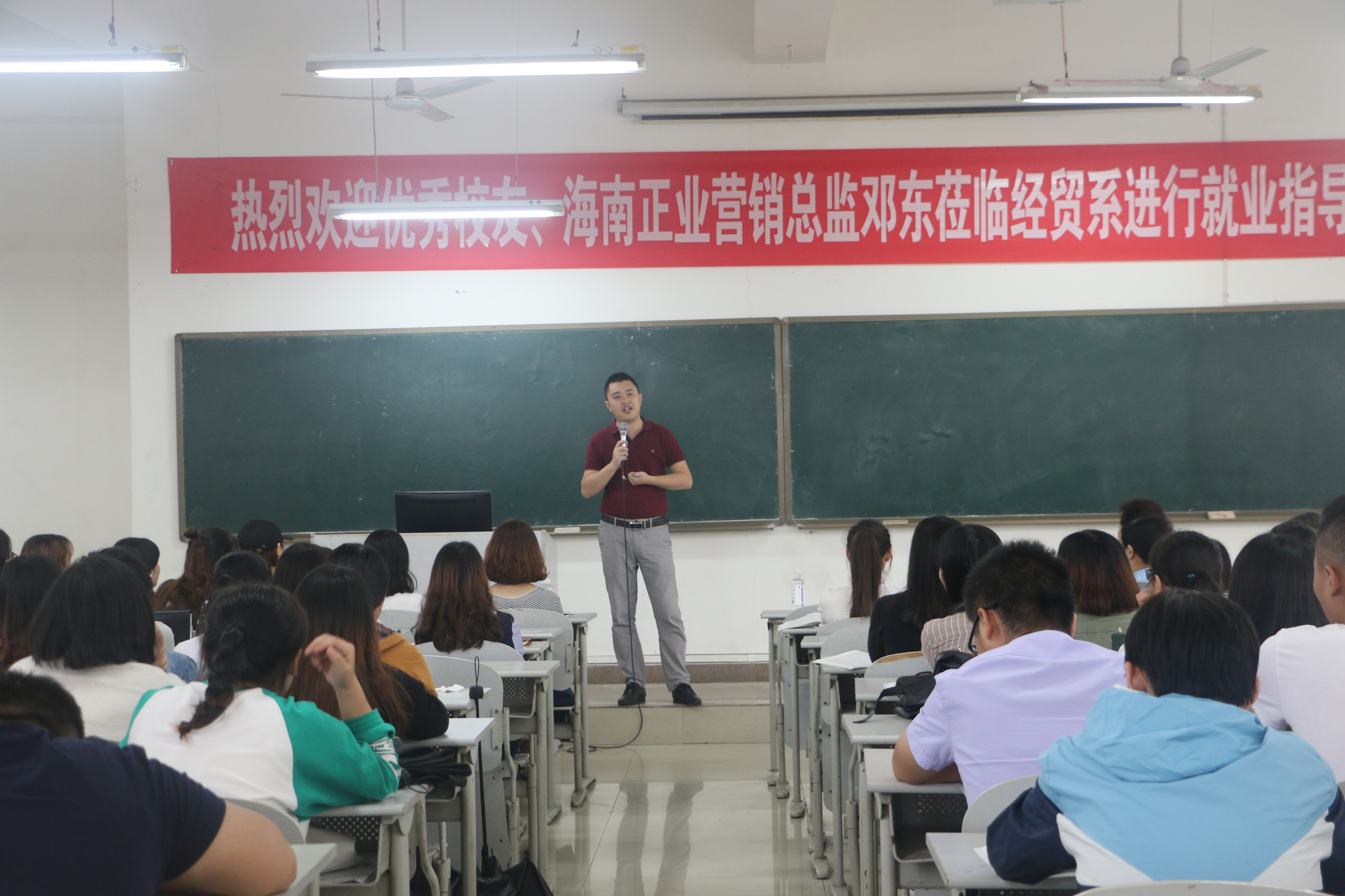 面对严峻的就业形势,为提升我系即将毕业学生的就业意识和竞争力,帮助他们找准目标,以优秀校友作为即将毕业学生的榜样,为他们树立良好职业发展的标杆,经济贸易系于09月21日15:30在博雅楼407举行优秀校友就业指导讲座。本次讲座由经济贸易系党总支书记赵琳教授主持,特邀我院2005届优秀校友、海南正业营销总监邓东前来为同学们主讲,经贸系经济管理专业全体学生参加。