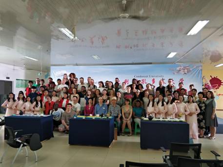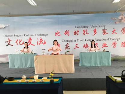 4月12日下午3点,茶艺表演正式开始,比利时孔多塞大学来访师生一行准时出现在了学院学生活动中心,本次茶艺表演分为两个部分,一个部分是由我们的学生进行茶艺表演,伴随着一曲《茉莉花》音乐声的响起,学生们用娴熟的技艺展示了中华茶艺的魅力,飘逸着茶叶的浓郁芳香,表演结束,全场爆发出热烈的掌声。