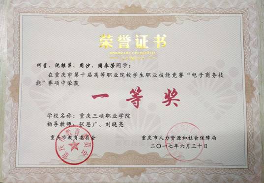 重庆市第十届高等职业院校学生职业技能竞赛“电子商务技能”赛项中荣获一等奖