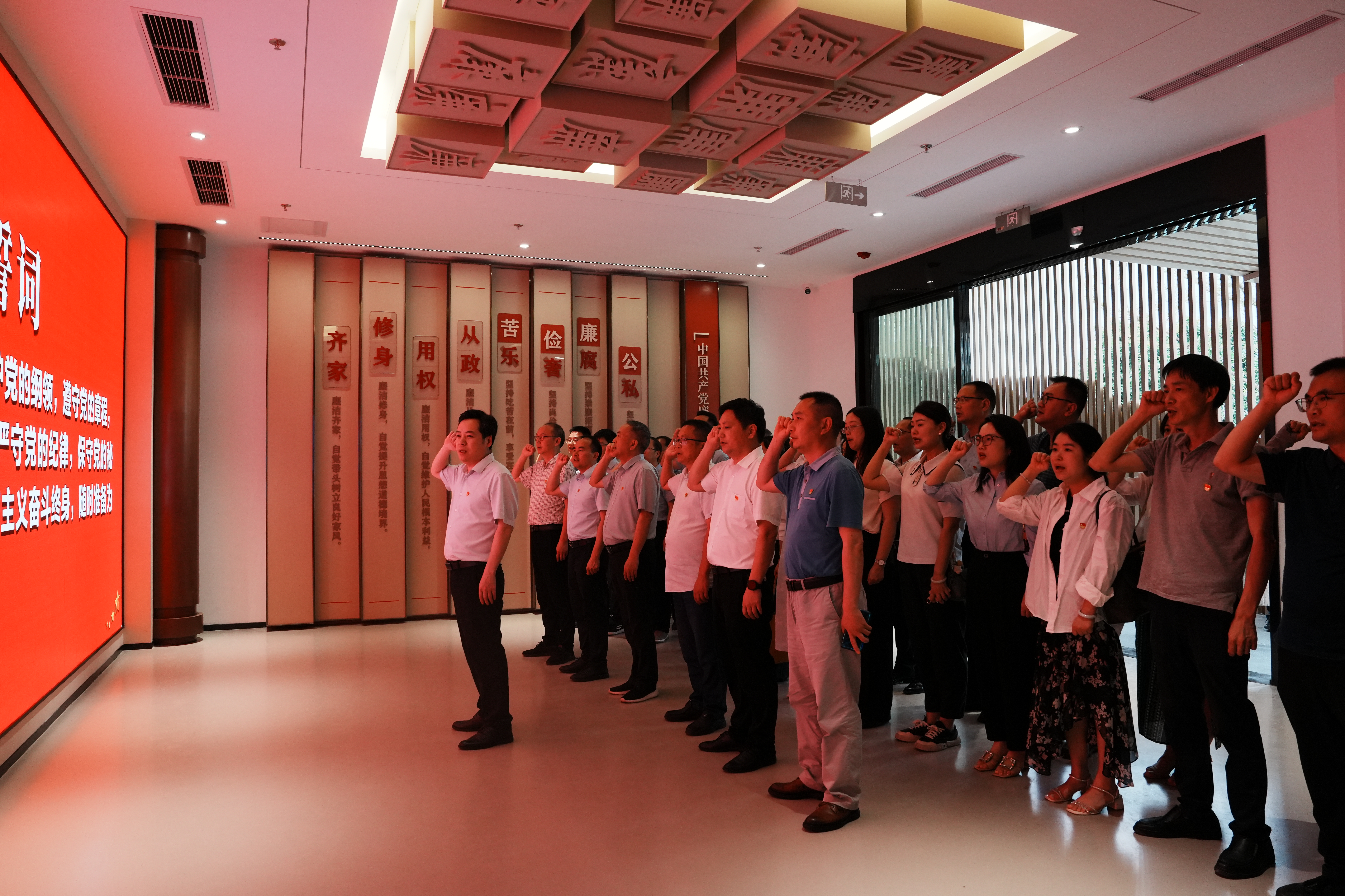 首先,全体党员干部面向党旗整齐列队,在党委书记谈建成的领誓下,举起右拳集体宣誓,重温入党时的庄严承诺。