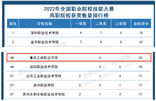 “聚焦职教”随即公布了“2022年全国职业院校技能大赛获奖数量排行榜”,我院以六个二等奖,加权得分18分,在689所获奖的高职院校中,排名第48名。