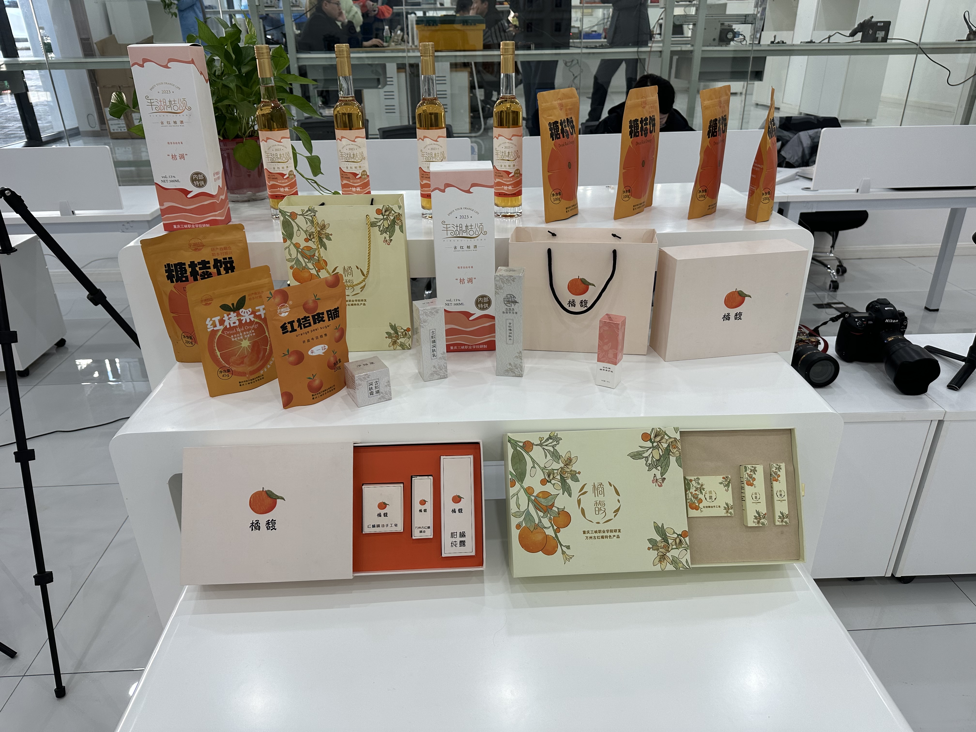 学院“平湖桔颂”团队成功入驻其中。平湖桔颂团队成立于2018年,是由学院农林科技学院师生共同组成的创新团队,产品依托重庆市市级双高“园艺技术”专业群、重庆市级乡村振兴专项“万州红桔种质资源保护与高效综合利用”项目进行研发,对盘活古红桔产业、助力乡村振兴具有重要意义。团队开发的古红桔果酒、果脯、果汁、香皂、精油等产品,受到市场消费者青睐。各界人士来到古红桔站台,驻足观看,表现出对该产品的浓厚兴趣。