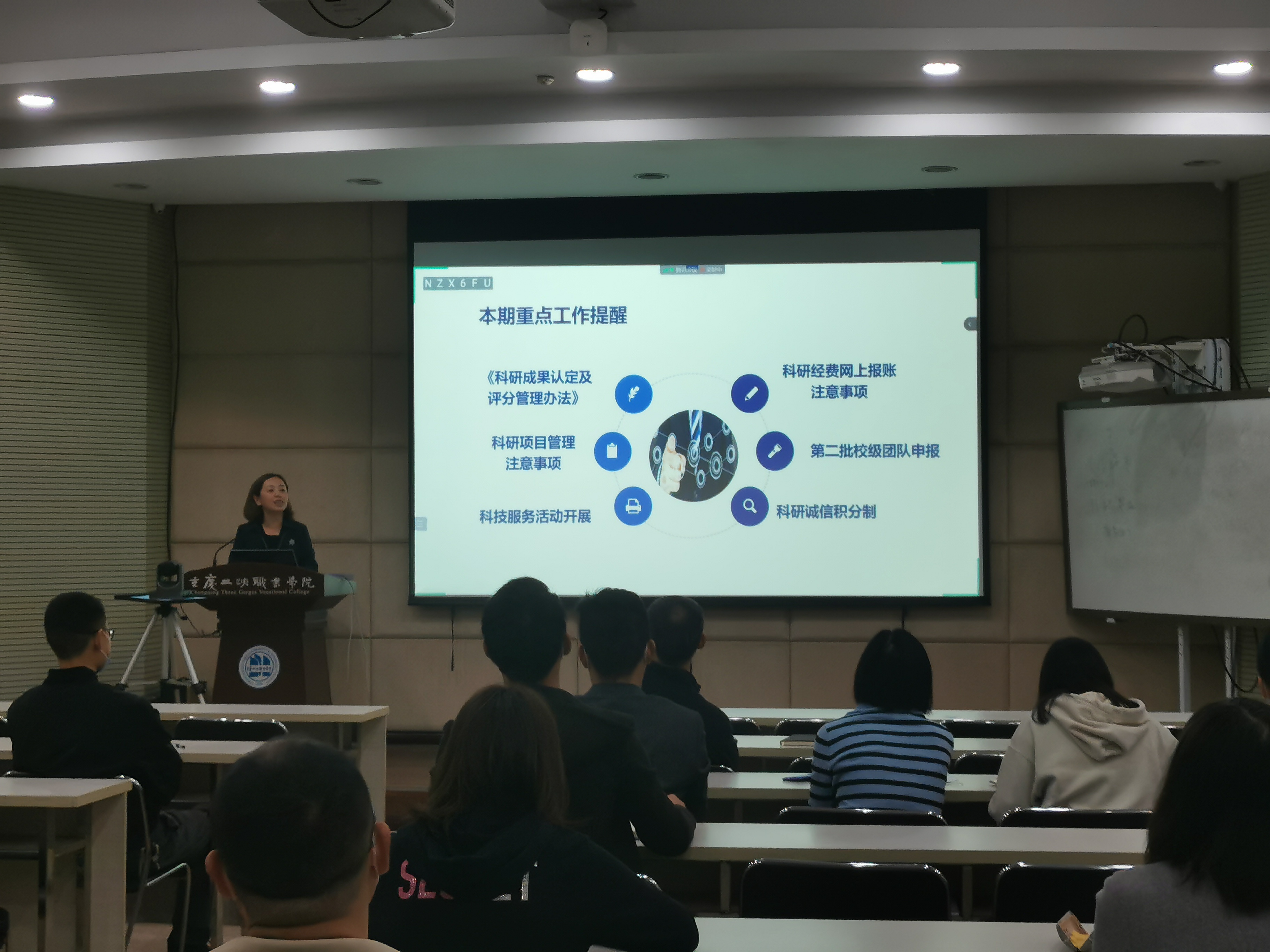 本次会议由科研处副处长聂青玉主持。聂青玉副处长分别对新制定的《重庆三峡职业学院科研成果认定及评分管理办法》、科研经费网上报账注意事项、科研项目管理注意事项、第二批校级科研创新团队申报、科研项目管理注意事项、科技服务活动开展注意事项等做了重点讲解,并对参会老师提出的相关问题,一一做了解答。