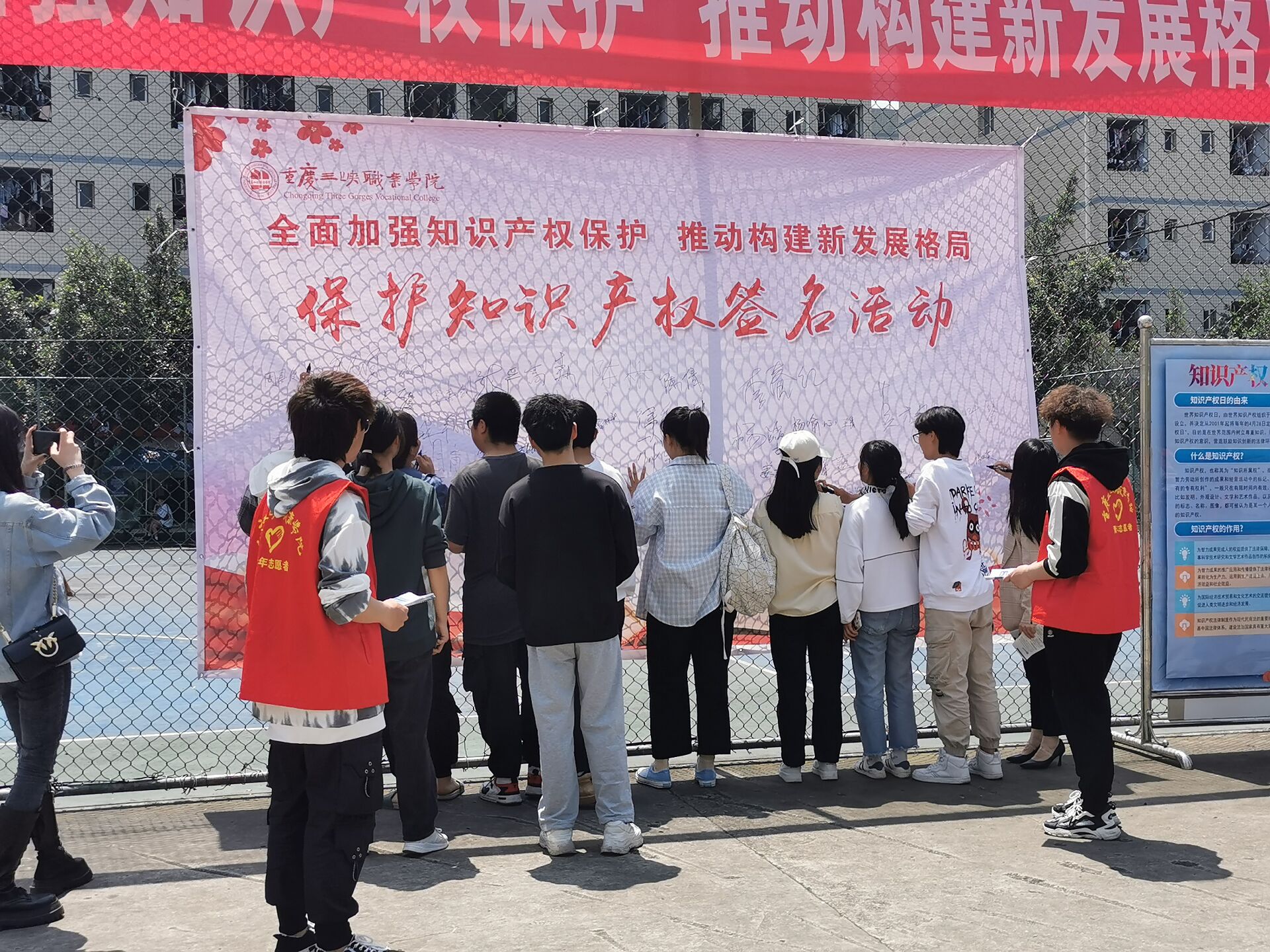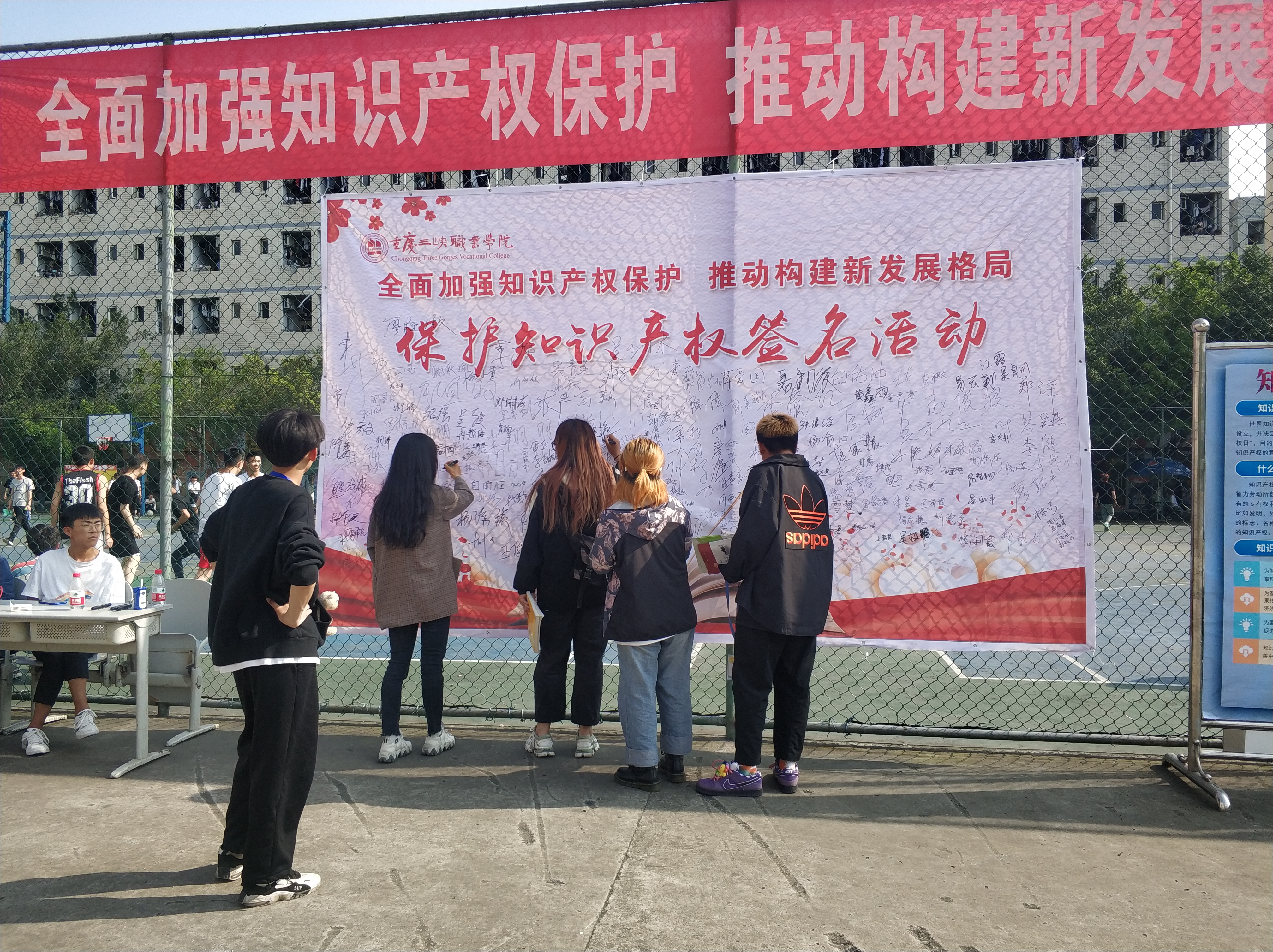 为深入贯彻落实习近平总书记关于知识产权工作的重要指示精神,大力倡导创新文化,4月22日,科研处联合校团委在学校篮球场组织开展了以“全面加强知识产权保护,推动构建新发展格局”为主题的知识产权保护签名活动。