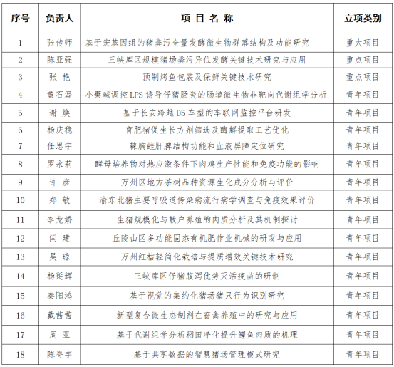 近日,2022年度重庆市教委科学技术研究计划立项通知文件下发,我校共计立项18项,其中重大项目1项、重点项目2项、青年项目15项(具体如下图所示)。本年度市教委科技项目立项数为学院有史以来最佳成绩。近年来,随着学院对科研工作的投入力度不断加大、双高建设持续推进,学院教师在科研项目申报上的积极性进一步提升,本次立项项目聚焦区域“三农”发展技术难点,涵盖生猪养殖、动物疫病防治、经果林种植、山地机械作业等相关领域,对促进区域经济社会发展,助力乡村振兴具有重要意义。下一步,科研处将做好服务工作,确保立项项目取得高质量成果并积极促成科技成果应用推广,促进实现社会经济效益。