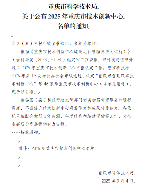 9月5日,重庆市科技局公布 2025 年重庆市技术创新中心名单,由学校牵头、动物科技学院和农林科技学院申报的“重庆市功能性动物源食品技术创新中心”成功获批,该中心系重庆市唯一一所以高职院校为依托申报获批建设的单位。
