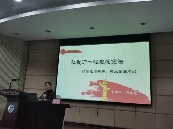 行走在普法路上,无论老师还是学生,都是神圣的见证者和身体力行的实践者。为了进一步加强广大师生的法治意识,养成法治思维,做到尊法、学法、守法和用法,2019年12月月10日,马克思主义学院邀请重庆城市管理职业学院副教授张媛艺为大学生开展宪法知识讲座,受到了广大师生的热烈欢迎和一致好评。