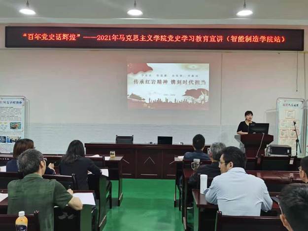 2021年5月11日,沈龙琼老师在奥训楼308以“传承红岩精神 镌刻时代担当”为主题,从“红岩人物故事”、“红岩精神内涵”、“传承红岩精神”三个方面为智能制造学院的全体教师以及学生代表作了一堂生动的党史教育专题宣讲。2021年5月19日,孙杨老师在博雅楼207为人工智能学院党总支师生作了以“讲红色故事 讲革命精神”为主题的党史学习教育专题宣讲,激情澎湃的为师生从谈判目的、谈判背景、谈判代表、谈判过程、谈判结果、谈判后续、历史意义等七个方面详细阐述了重庆谈判。2021年5月25日,马丽老师为汽车工程学院全体教师以及学生代表以“缅怀革命烈士,弘扬民族精神”为主题展开宣讲,围绕邱少云同志不屈不挠的一生带领大家感悟了革命先烈的光荣事迹。