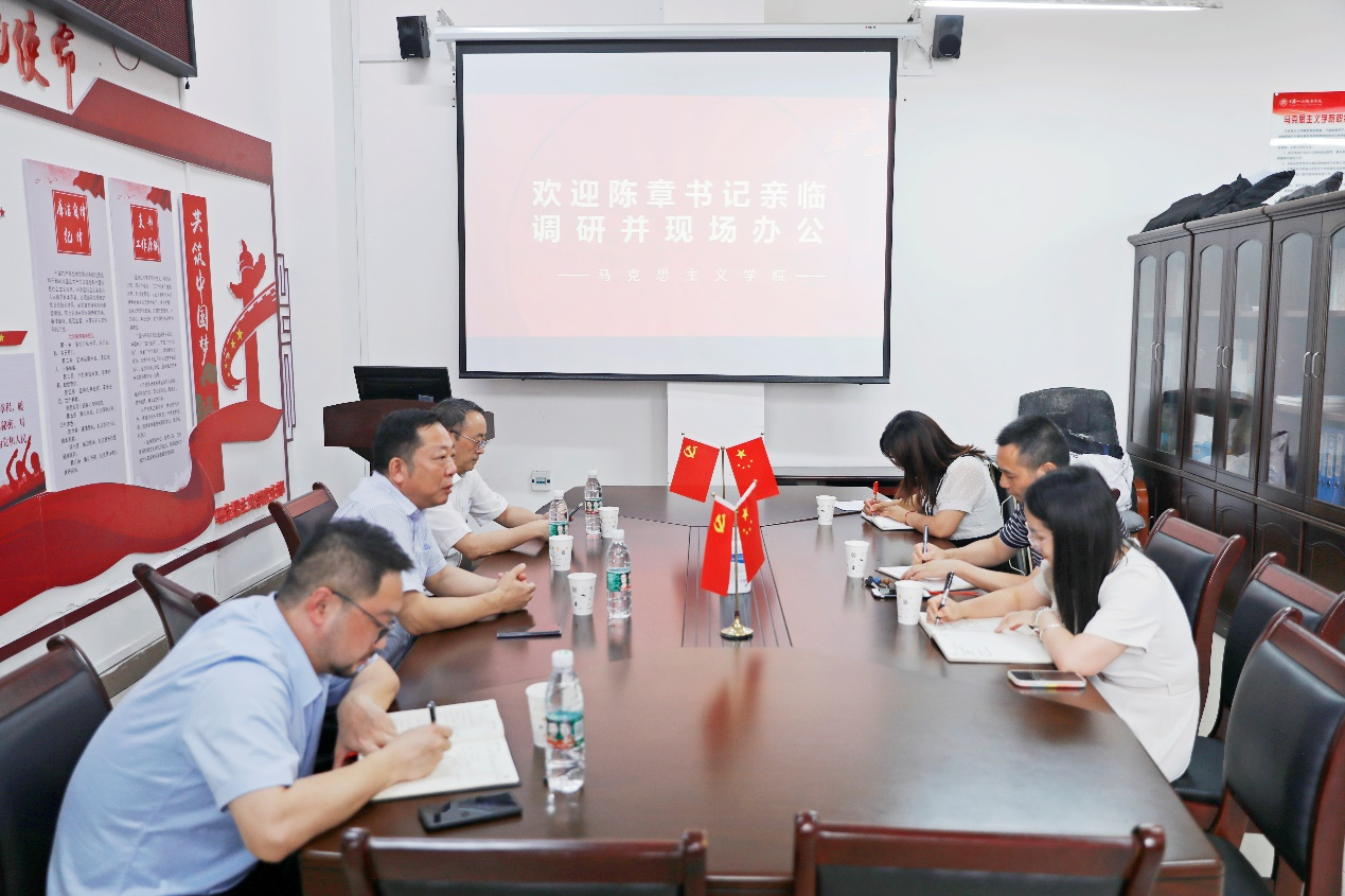 7月7日下午,学校党委书记陈章带队到马克思主义学院调研指导工作,就马院建设发展进行研究部署。党委副书记张智陪同调研。党政办负责人、马克思主义学院党政领导班子、支委会成员参加座谈。