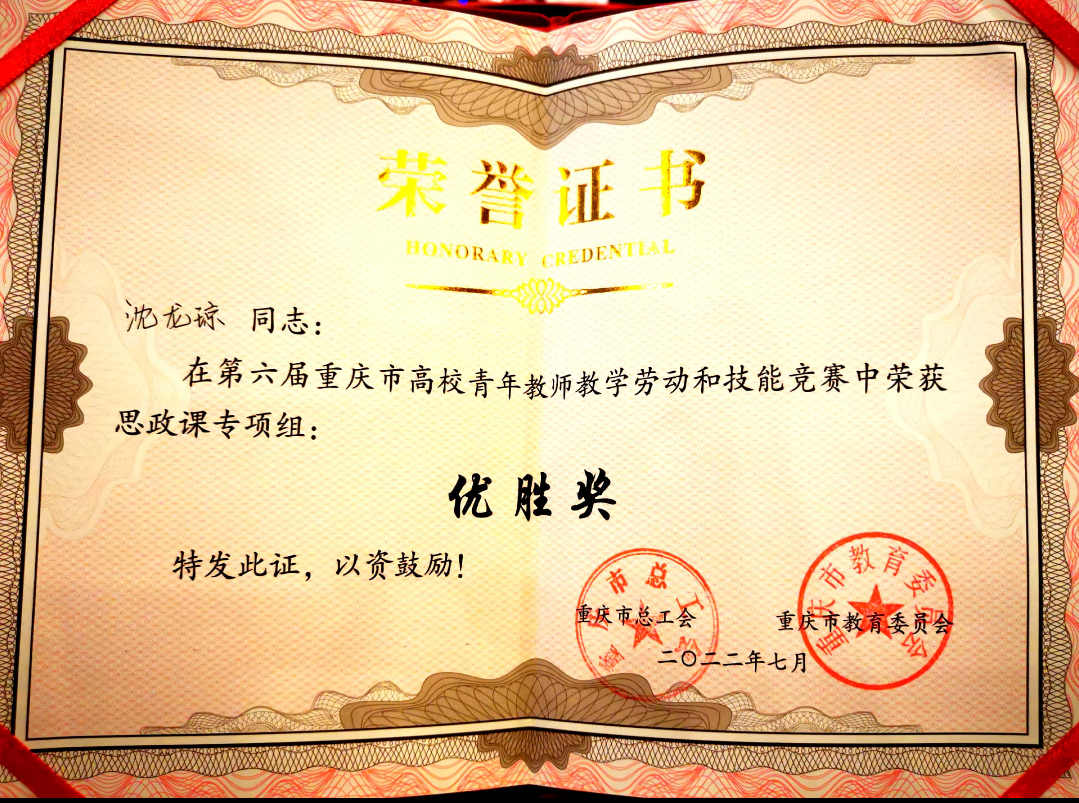 7月8日,第六届重庆市高校青年教师教学劳动和技能竞赛决赛在重庆工商大学圆满落幕。马克思主义学院沈龙琼老师喜获优胜奖。