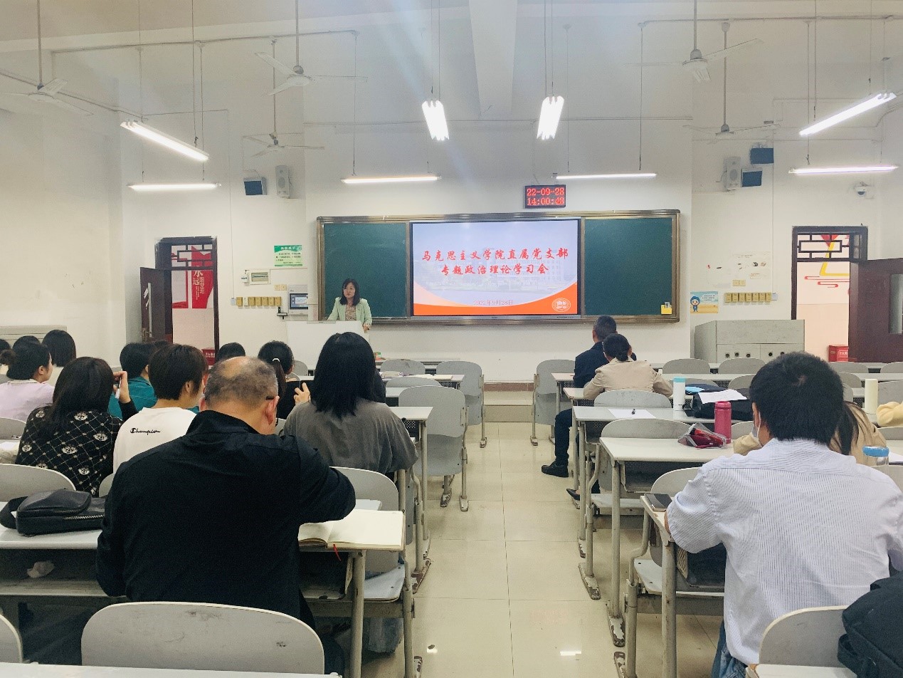 深入学习贯彻习近平总书记重要讲话精神是思政课教师提升政治素养的主渠道、主阵地,按照《中共重庆三峡职业学院委员会关于印发<迎接党的二十大胜利召开教职工专题政治学习实施方案>的通知》要求,9月28日下午马克思主义学院直属党支部全体党员聚集博雅楼108开展政治学习活动,学校党委委员、宣传部部长姜荣到会指导学习,党支部副书记丁翠娟主持学习会。为了让政治理论学习变得“有深度”“受欢迎”,马克思主义学院直属党支部改变了以往的做法,采取“领学+研讨+结合”的方式,让政治学习更紧密地结合实际,并指导工作。