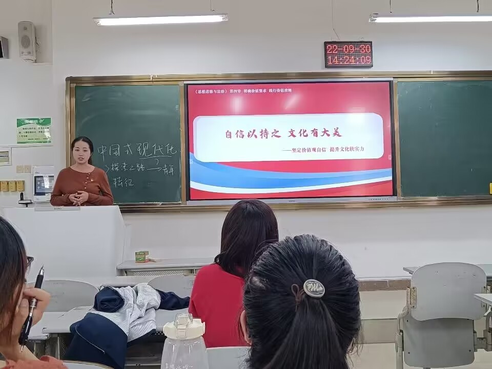 沈龙琼老师和陈玥秋老师分别以“理解中国式现代化新道路”、“自信以持之,文化有大美——坚定价值观自信 提升文化软实力“为题做示范课堂展示。两位老师展示完毕后,各位老师分别就展示情况及如何打造示范课堂行交流探讨。大家一致认为此次”示范课堂“展示交流活动具有很好的示范引领作用,有助于教育教学水平提升,也有利于集全院智慧打造思政“金课”。