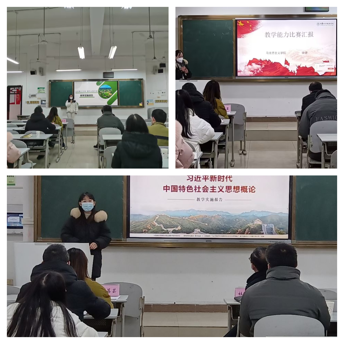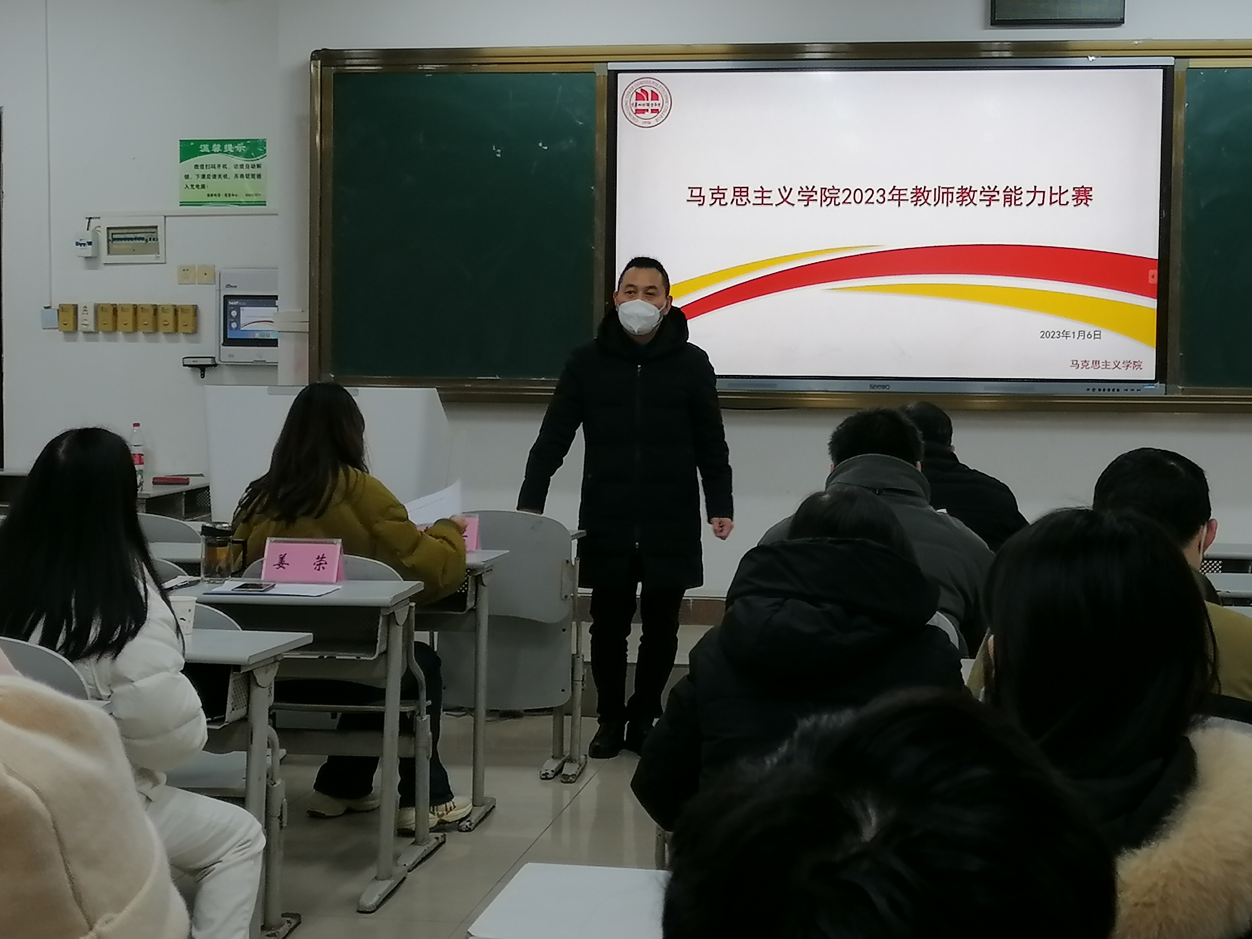 为进一步推进马克思主义学院教师教学团队建设,提高教师专业教学能力、综合育人能力和自主发展能力,根据《重庆三峡职业学院关于印发2023年教师教学能力比赛方案的通知》(三峡职院教〔2022〕30号),2023年1月6日在博雅楼108教室举办2023年度马克思主义学院教师教学能力比赛,现场邀请了质量保证与评估中心杜绍奎主任、教务处幸荔芸副处长、重庆市教学能力大赛获奖教师张昆、谢红,以及马克思主义学院姜荣院长担任比赛评委。