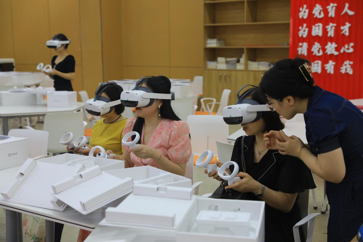 最后,全体成员参观了重庆三峡职业学院马克思主义学院思政课虚拟仿真实践教学中心。在实训中心技术员的讲解下老师们借助VR眼镜在虚拟场域里体验不同的思政教学资源,大家纷纷表示充分利用虚拟仿真课程资源,打造“沉浸式、体验式、互动式”课堂更容易调动学生的积极性,提升思政课教学的有效性和针对性。