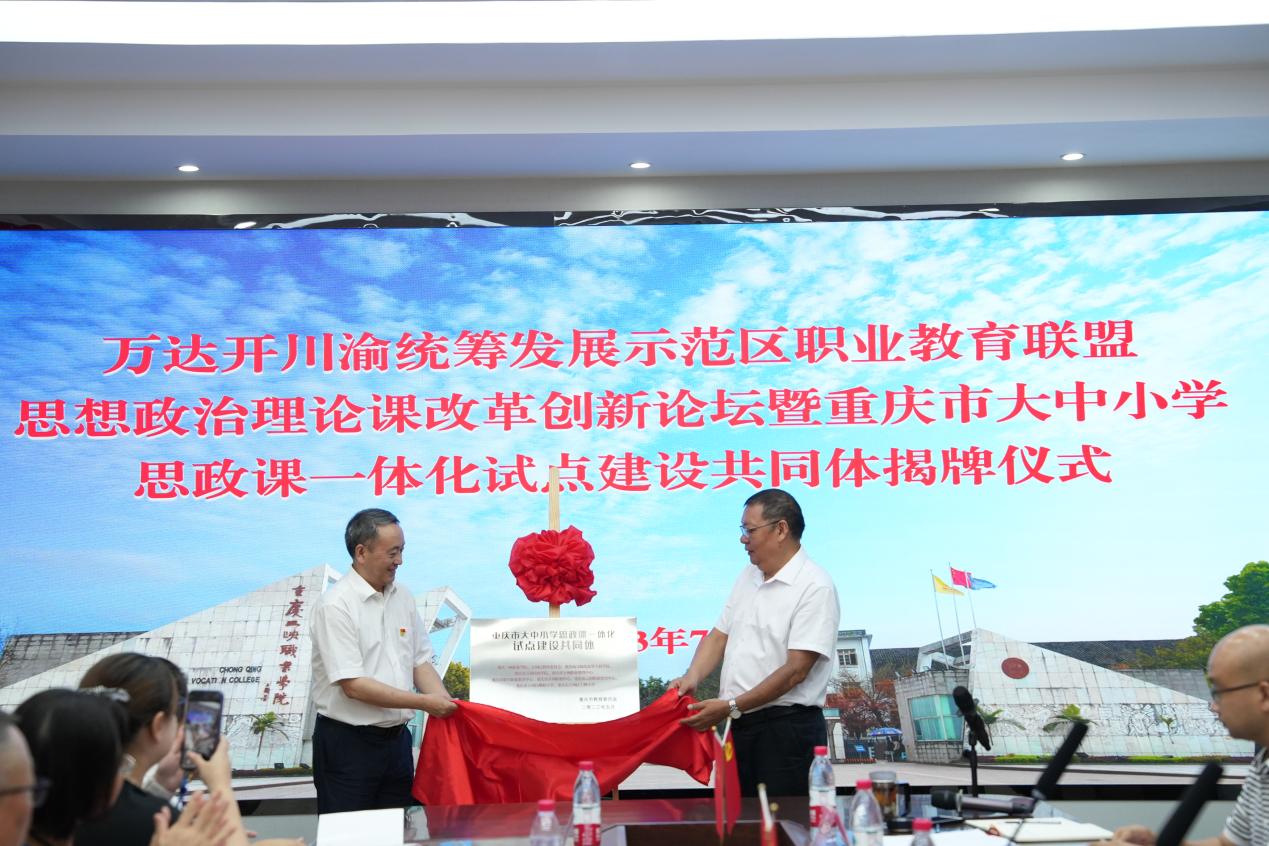 为深入推进思政课改革创新和大中小学思政课一体化建设,推动新时代学校思政课建设内涵式高质量发展,更好地用党的创新理论铸魂育人,7月5日,万达开川渝统筹发展示范区职业联盟思想政治理论课改革创新论坛暨重庆市大中小思政课一体化试点建设共同体揭牌仪式活动及集体备课会在我院隆重举行。会议由学院党委委员、宣传部部长、马克思主义学院院长姜荣主持,重庆市万州区教育委员会二级调研员林明富、学院党委副书记张智教授及达州市职业高级中学、达州职业技术学院、重庆幼儿师范高等专科学校、重庆万州技师学院、重庆市万州职业教育中心、重庆市梁平职业教育中心、重庆市开州区职业教育中心、重庆市云阳职业教育中心、重庆市万州区鹏程小学、重庆市万州区王牌小学等成员单位相关领导、教师出席本次活动。