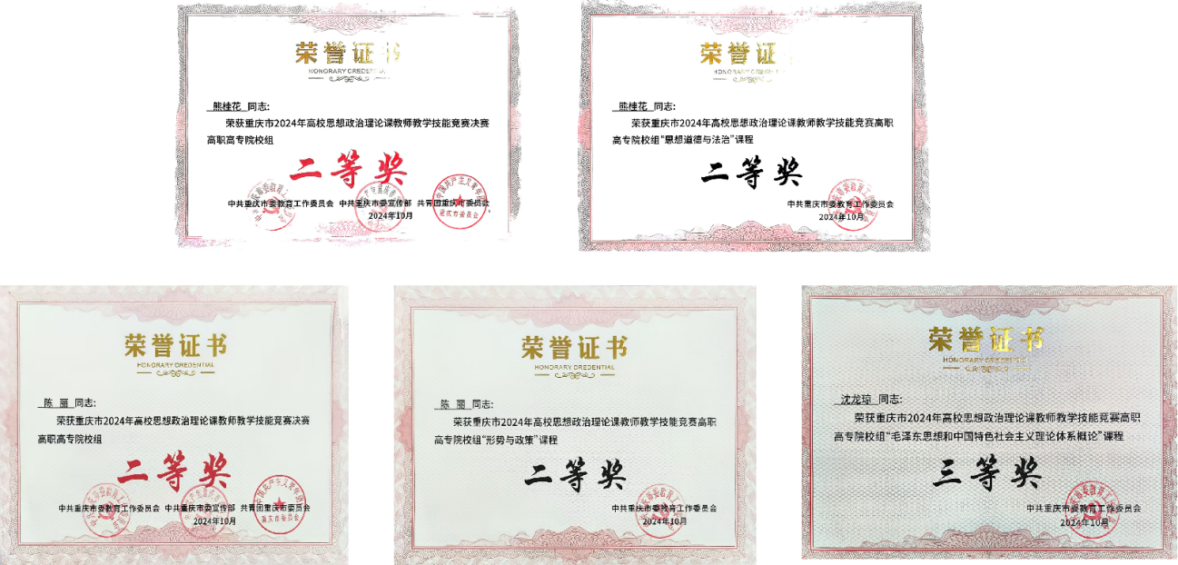近日,由市委教育工委、市教委,市委宣传部,共青团重庆市委员会主办,重庆科技大学承办的重庆市2024年高校思政课教师教学技能竞赛决赛成功举办,80名教师晋级决赛一决高下。决赛分为本科院校组和高职高专院校组两个组别,包含教学设计和现场授课两个环节。参赛教师按照随机抽取的章节题目,紧紧围绕课程目标,科学设计教学内容,进行8分钟的现场授课。我院熊桂花、陈丽两位老师荣获高职高专院校组决赛“二等奖”。在之前的课程复赛中,熊桂花老师荣获《思想道德与法治》课程组“二等奖”,陈丽老师荣获《形势与政策》课程组“二等奖”,沈龙琼老师荣获《毛泽东思想和中国特色社会主义理论体系概论》课程组“三等奖”。