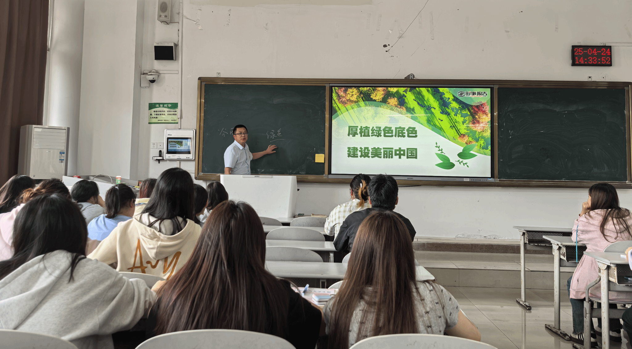 为深入学习贯彻习近平新时代中国特色社会主义思想,加强大学生思想政治教育工作,更好地落实立德树人根本任务,4月24日下午,学院党委委员、副院长袁德梽走进思政课堂,以“厚植绿色底色、建设美丽中国”为主题,为农林科技学院2024级园林技术3班和2024级休闲农业经营与管理的同学们带来了一堂生动且富有深度的思政课。