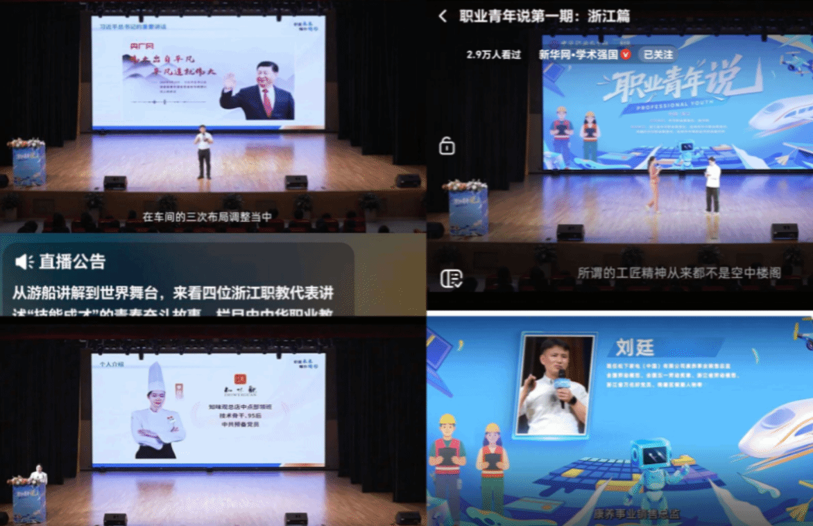 直播中,四位来自浙江的职教优秀代表,以独特的视角,从游船讲解的细微之处,延伸至世界舞台的广阔天地,深情讲述了各自“技能成才”的青春奋斗历程。他们或在传统技艺传承中精益求精,或在现代科技领域开拓创新,用汗水与智慧书写着属于职业教育人的精彩篇章。每一个故事都充满着对职业的热爱与执着,展现了职业青年以技能立身、凭奋斗出彩的精神风貌。