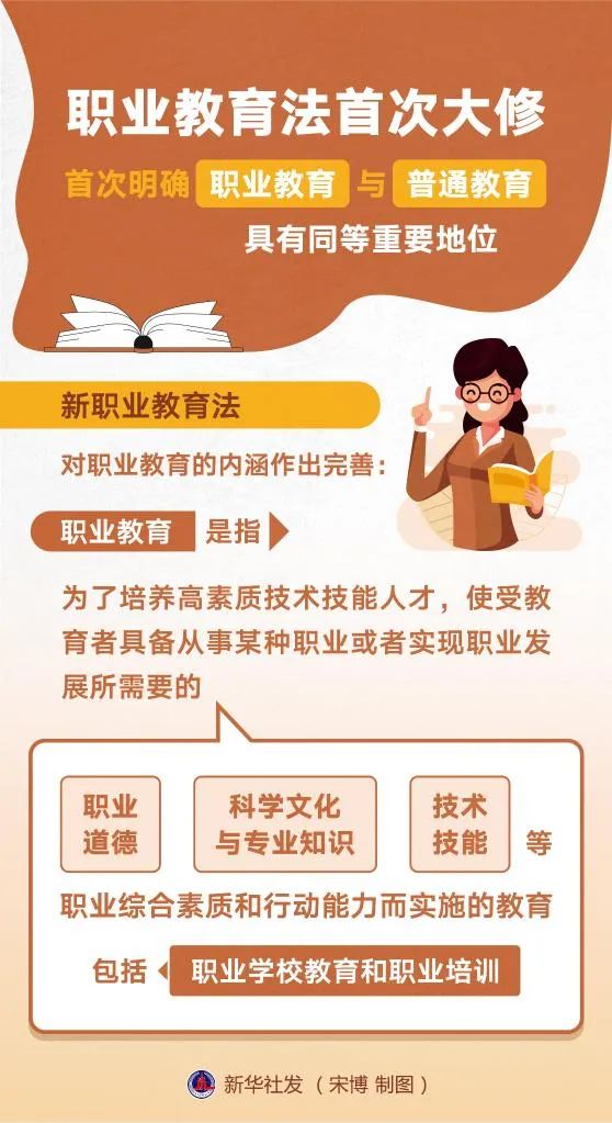 新职业教育法对职业教育的内涵作出完善:职业教育,是指为了培养高素质技术技能人才,使受教育者具备从事某种职业或者实现职业发展所需要的职业道德、科学文化与专业知识、技术技能等职业综合素质和行动能力而实施的教育,包括职业学校教育和职业培训。