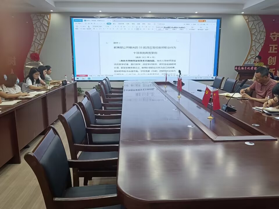 其次,积极动员教师持续开展好并完成“师德集中学习教育”专题网络学习,集中宣读了教育部公开曝光的33起违反高校教师职业行为十项准则典型案例。一起起“鲜活”的反面教材,再次给每一位教师敲响了廉洁自律、洁身自好的警钟,激励我们要时刻强化廉洁自律意识、做勤政廉政表率,也表明了党和国家正风肃纪的坚定决心,起到了良好的警示作用。