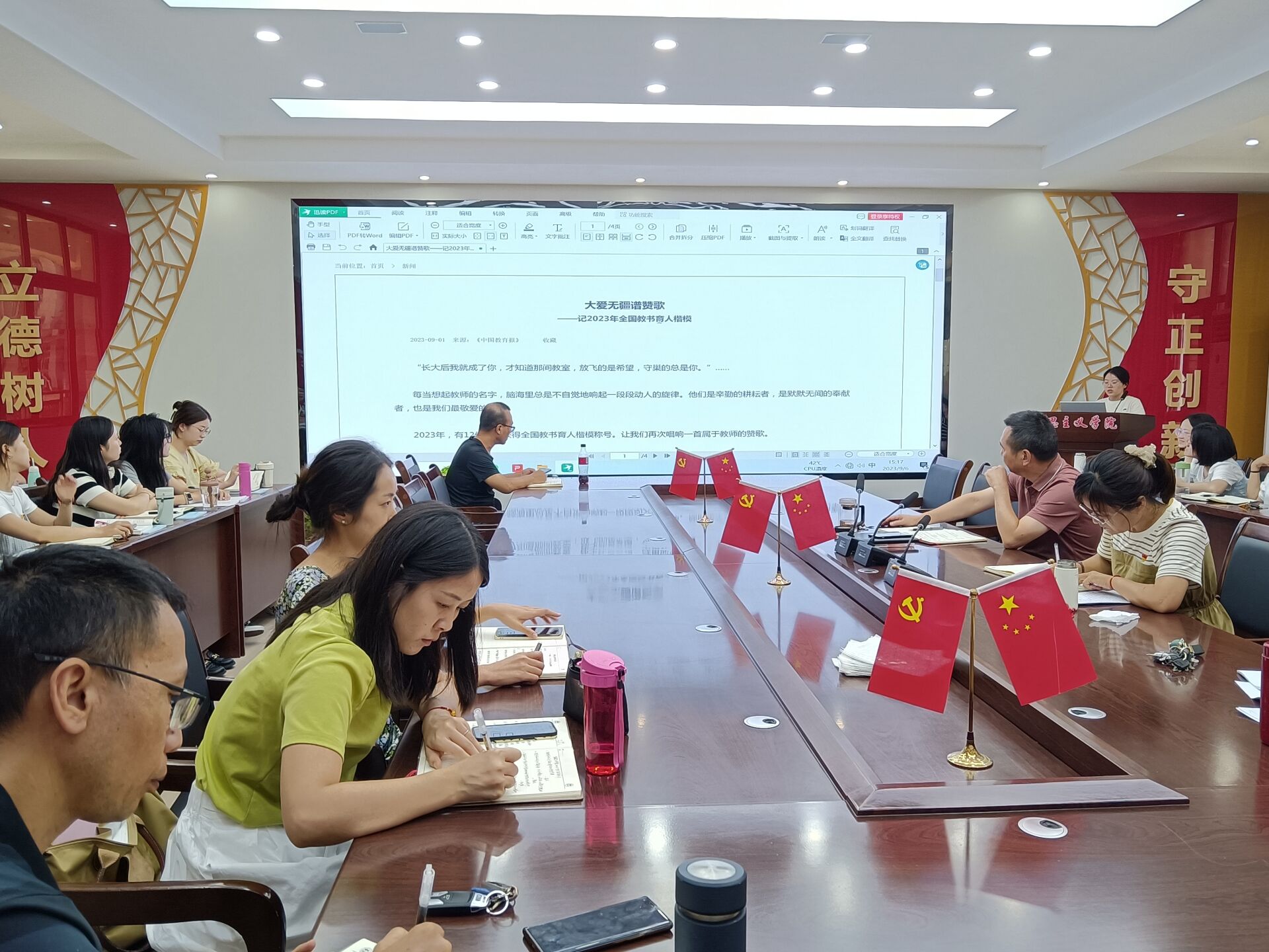 2023年9月6日下午马克思主义学院在奥训楼403会议室,召开了教职工政治理论和师德师风学习会,马院全体教职工参加了学习。