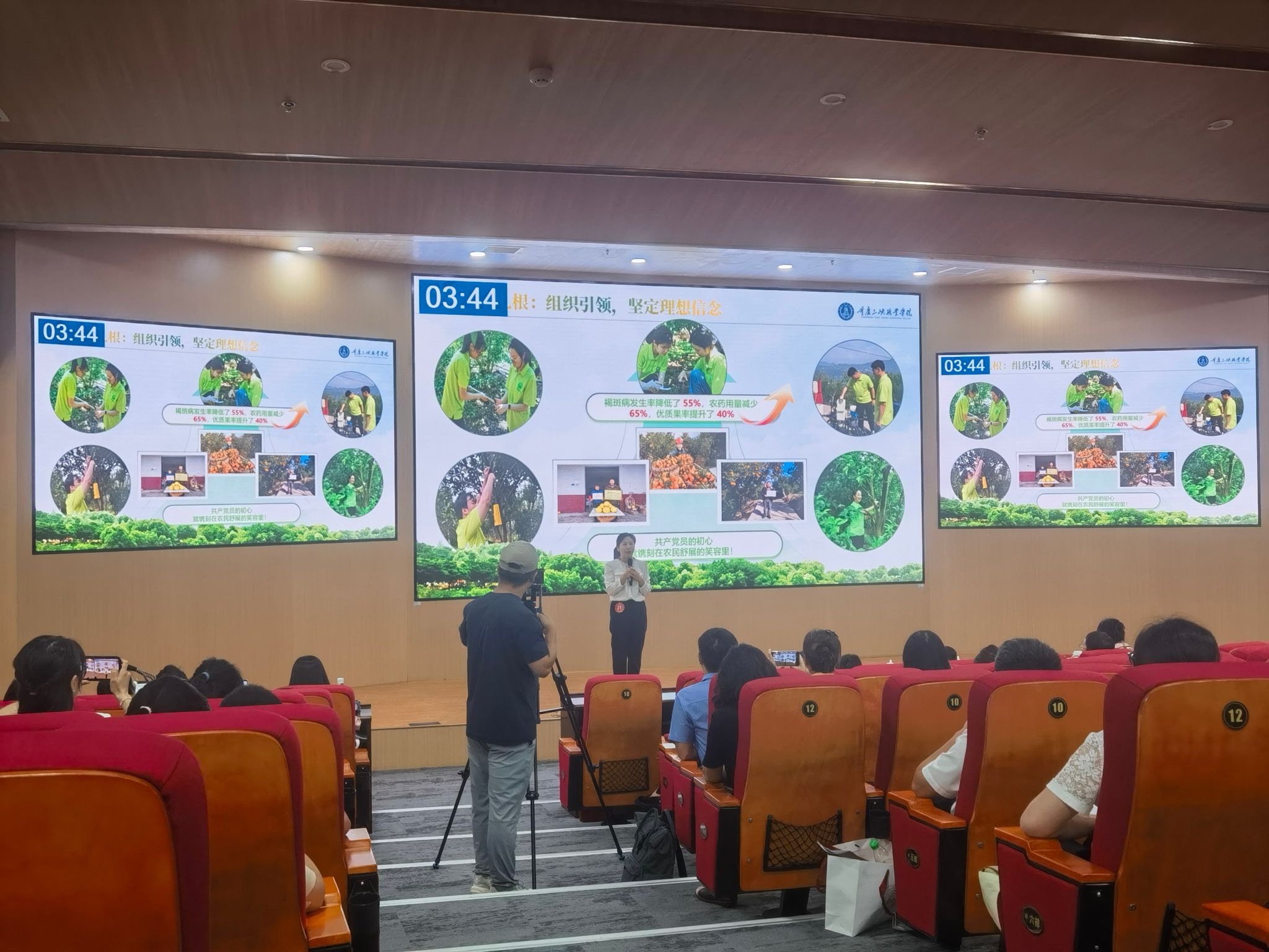 在理论宣讲环节,余夏君以“扎根沃土、花开田野、果献时代——新时代农林青年的乡村振兴誓言”为主题,深入贯彻习近平总书记给中国农业大学科技小院的回信精神,巧妙运用“扎根—开花—结果”这一人才培养轨迹,将新时代农林青年投身乡村振兴的生动故事娓娓道来。她的宣讲饱含深情,既有理论的高度,又有实践的温度,充分彰显了高校基层党组织在乡村振兴战略中的使命担当与积极作为,赢得了现场观众的阵阵掌声。